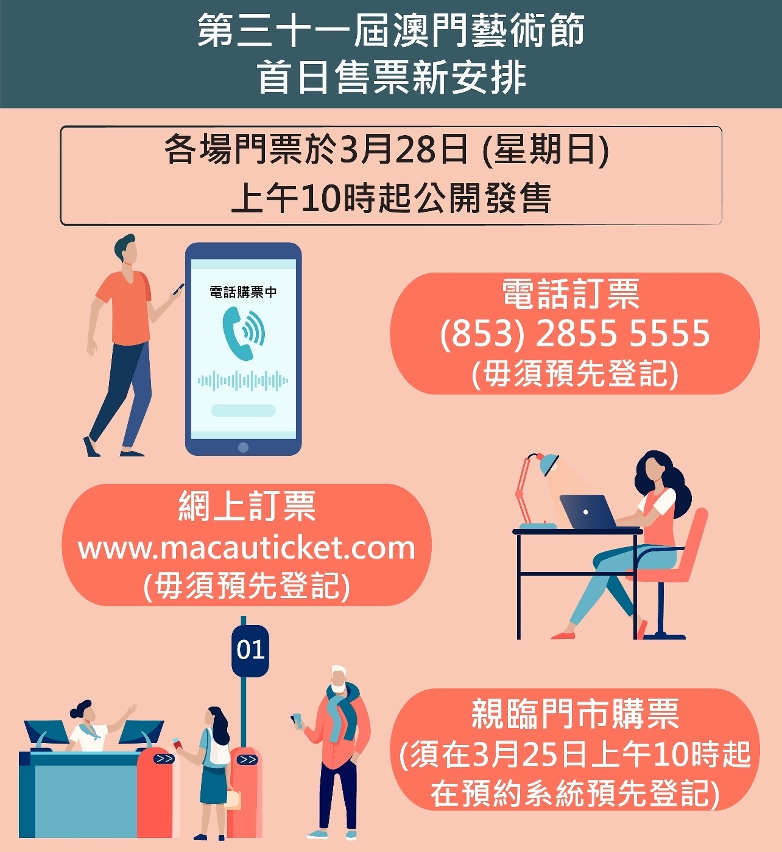 為優化澳門藝術節購票安排,為觀眾帶來省時便捷的購票服務,主辦單位今年同步開通現場及電子多元購票模式,特設首日售票網上預約系統,系統於3月25日(星期四)上午10時起開通,選擇在首日售票當日上午10時至下午3時親臨澳門售票網門市購票之觀眾,透過系統憑手機電話號碼預約購票時段,成功預約者便可按時段前往自選門市購票。有需要協助使用網上預約系統的市民,亦可於預約系統開放期間且澳門售票網門巿營業時間內親臨任何一間澳門售票網門市由專人協助辦理。預約時段名額有限,先到先得,每一組手機電話號碼僅可作一次登記。而選擇電話及網上訂票的市民毋須預先進行登記。