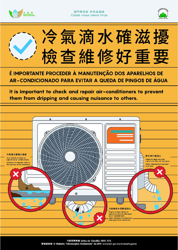 不少市民使用冷氣機時,可能會忽略檢查冷氣機的排水喉管是否已經妥善接駁,從而衍生滴水問題,冷氣機水滴落簷篷的聲音不但滋擾他人,所造成的積水亦有機會孳生蚊蟲,影響公共衛生。市政署呼籲市民在使用氣機前,應先檢查排水喉管有否妥善接駁或出現斷裂、底盤有否滿溢或滲漏等情況,如有滴水問題應盡快改善或邀請專業冷氣技師進行維修。