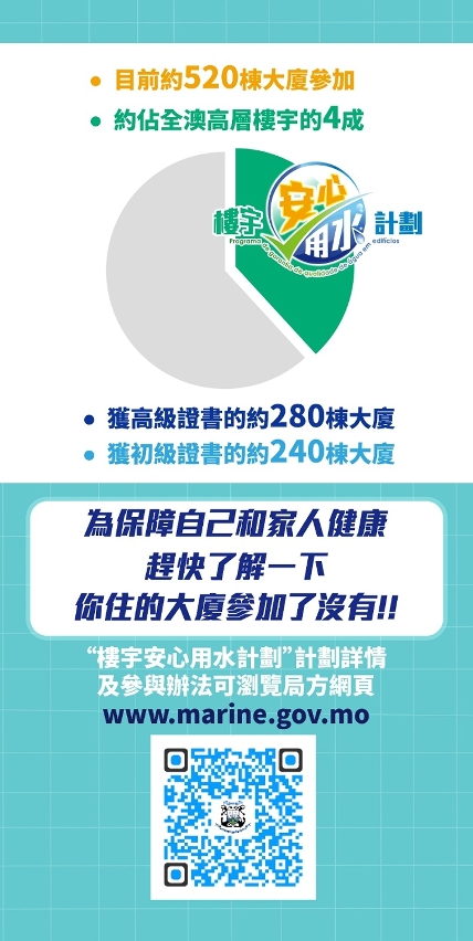 “樓宇安心用水計劃”旨在促進大廈業主及物業管理實體加強樓宇自來水系統的維護管理,目前共520棟大廈參加,約佔全澳高層樓宇的四成,其中獲高級證書的有280多棟大廈,獲初級證書的有240多棟大廈。參與計劃的樓宇只要按要求對內部自來水系統進行維護,包括每半年清洗水箱一次等,即可獲發初級證書;如在此基礎上進行水質檢驗且合格,更可獲發高級證書。計劃詳情及參與辦法可瀏覽局方網頁www.marine.gov.mo。