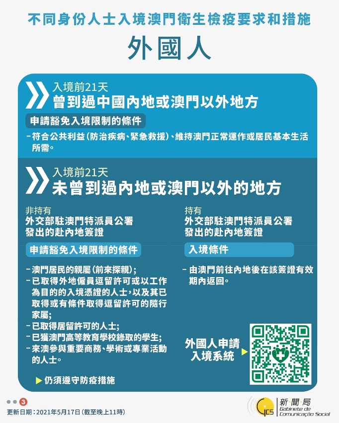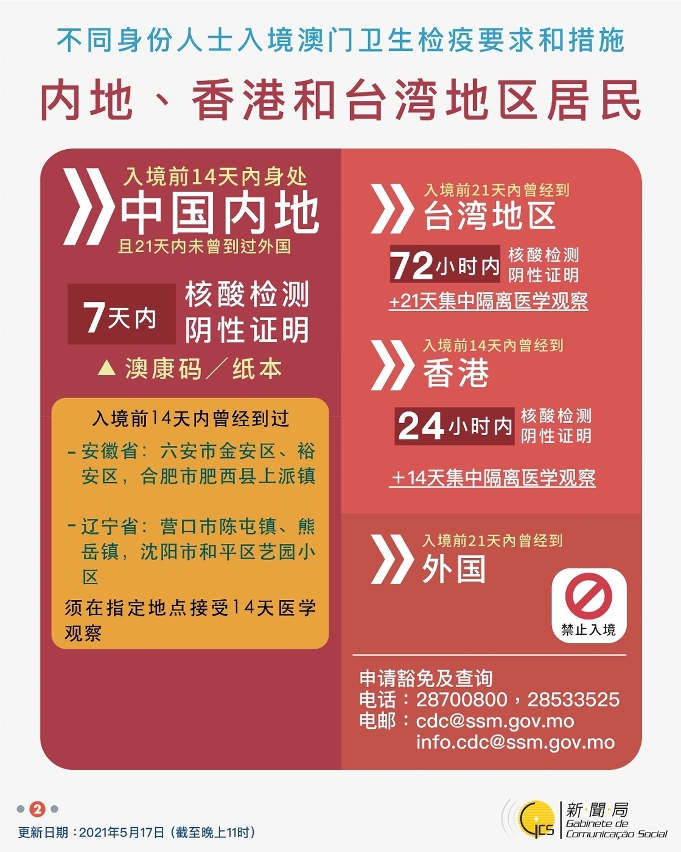 【圖文包】2021/5/17最新入境澳門衛生檢疫要求和措施