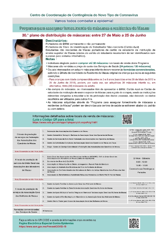 新型冠狀病毒感染應變協調中心今(24)日公佈,第30輪保障口罩供應澳門居民計劃(下稱“口罩計劃”)於週四(27日)開始,售賣期間為30日,即2021年5月27日至6月25日,期間每人可一次性購買30個口罩,售價合共24澳門元。 自第30輪口罩計劃起,衛生中心及衛生站停售口罩,由衛生局協議藥房、本澳三個社團(工聯、街總、婦聯)繼續提供售賣口罩服務,即全澳共有72個售賣點,服務時間詳見附圖。透過口罩計劃購買的口罩,如有不合格或次貨可退回衛生中心。