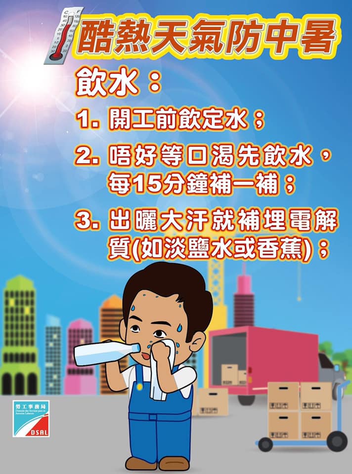 勞工事務局現備有「炎夏中暑勿輕心  休息補水要留神」海報,歡迎巿民索取和張貼於工作場所;另外,亦正推出「抗熱服及防曬帽套」推廣計劃,申請對象為僱員人數不超過300人的本澳建築業、物流業、會展業、清潔業、園藝業等涉及戶外工作的中小型企業。凡合資格申請之本澳企業,其每名本地僱員將可獲勞工事務局免費發給2件抗熱服及1個防曬帽套,以及可免費報讀「工作間的急救護理常識」證書課程。有關計劃詳情,可瀏覽勞工事務局網頁www.dsal.gov.mo,查詢電話:28717781。