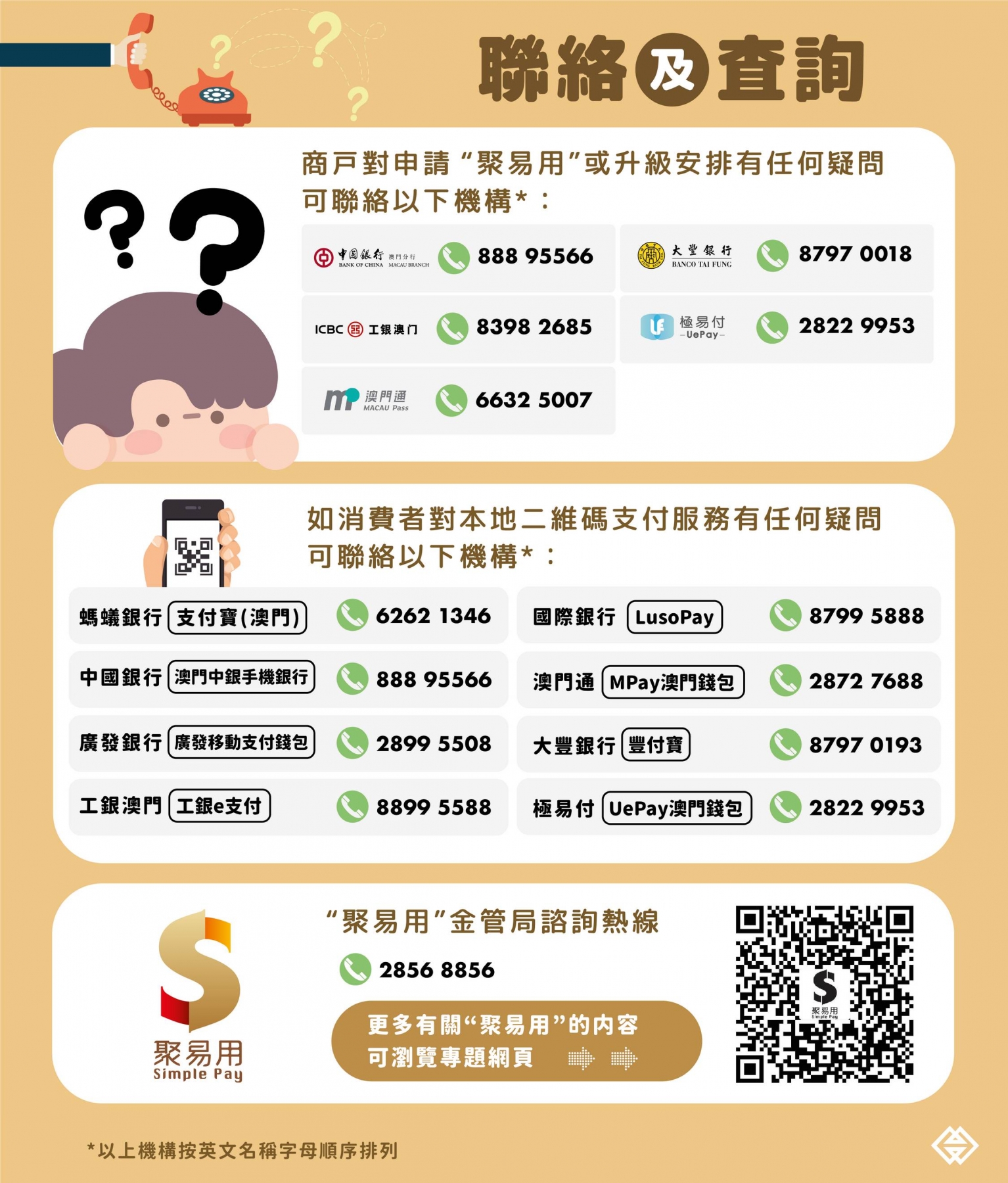 為方便居民瞭解各移動支付服務的操作,金管局及經科局早前已協調8間金融機構推出“使用電子消費優惠示範短片”,演示消費付款、查詢餘額或交易詳情等各項功能及步驟,短片亦已上載至“計劃”專頁( https://www.dsedt.gov.mo/econsumo/zh_TW/cst_tutorials.jsp )。居民如有任何疑問,可聯絡相關金融機構查詢,亦可於辦公時間聯絡金管局。