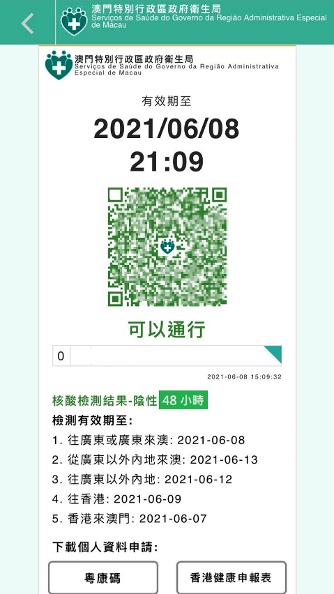 根據疫情防控需要,經珠澳聯防聯控機制協商一致,今天(6月8日)上午10時起,所有經珠澳口岸往返廣東與澳門的人士,必須持有由認可醫療機構48小時內作出的核酸檢測陰性報告。48小時內核酸檢測報告有效期是指採樣後的2天內,即6月6日採樣後,6月8日晚上24時之前均屬有效期內並可進出境。自機場入境的旅客核酸檢測要求不變。因應新措施,治安警察局已提前做好工作預案,並與珠澳相關部門密切聯繫,確保了上午通關情況有序。