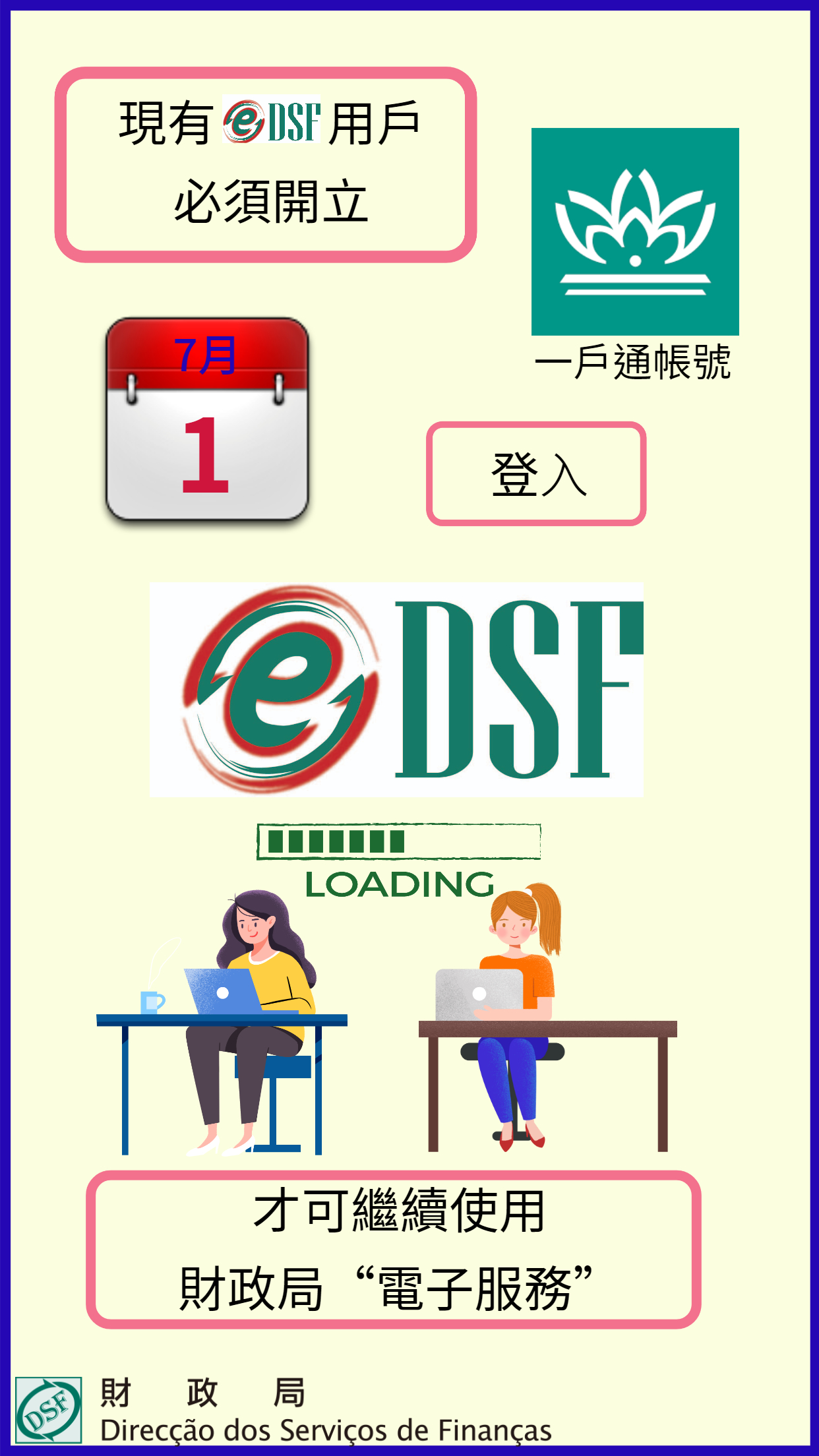 因應第2/2020號法律《電子政務》及第24/2020號行政法規《電子政務施行細則》第二十四條(一)項的規定,作為統一各公共部門電子服務平台的過渡性安排,自本年七月一日起,所有財政局電子服務的用戶只能以“一戶通”的用戶名稱及密碼,登錄財政局電子服務系統,原來財政局電子服務的用戶名稱及密碼將於同日起失效。