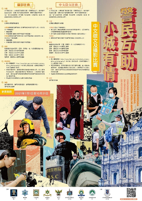 為更好地推動警隊文化建設的工作,把警民合力的理念深入社區,以建立警民良好關係,提升警務效能。澳門保安部隊及保安部門今年舉辦的中文徵文比賽及攝影比賽以「警民互助,小城有情」為題,旨在凝聚維護有序社會的力量,傳遞警民同心互助,共同創建和諧安定的澳門。兩項比賽的徵集期均於2021年7月1日至10月31日期間接受報名,歡迎踴躍參與。