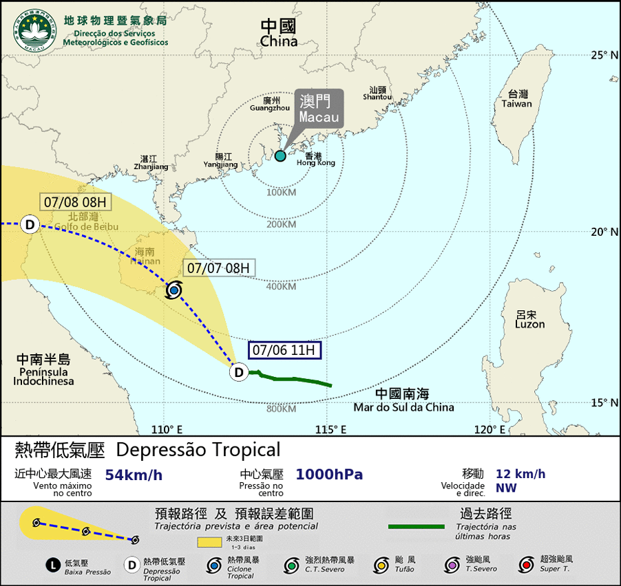 位於台灣附近的熱帶低氣壓,預料晚間大致移向廣東東部至福建一帶。由於其環流較小及強度將會減弱,預料對本澳影響不大。另外,位於南海中部的熱帶低氣壓,未來一兩日大致移向海南島一帶。預料本澳今日稍後時間將轉趨多雲,未來一兩日驟雨增多及風力增強。另一方面,由於近日非天文大潮,本澳出現風暴潮水浸機會不大,請市民密切留意最新天氣消息。