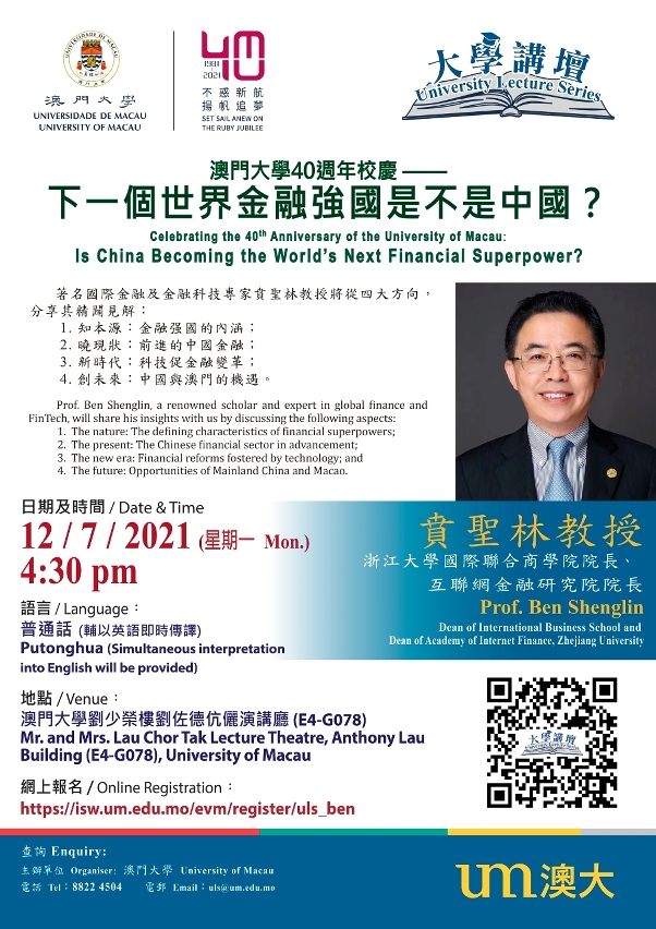 澳門大學將於7月12日(星期一)舉辦“澳門大學40週年校慶——大學講壇”講座,由浙江大學國際聯合商學院院長、互聯網金融研究院院長賁聖林以“下一個世界金融强國是不是中國?”為題發表演說,探討前沿金融發展和趨勢。