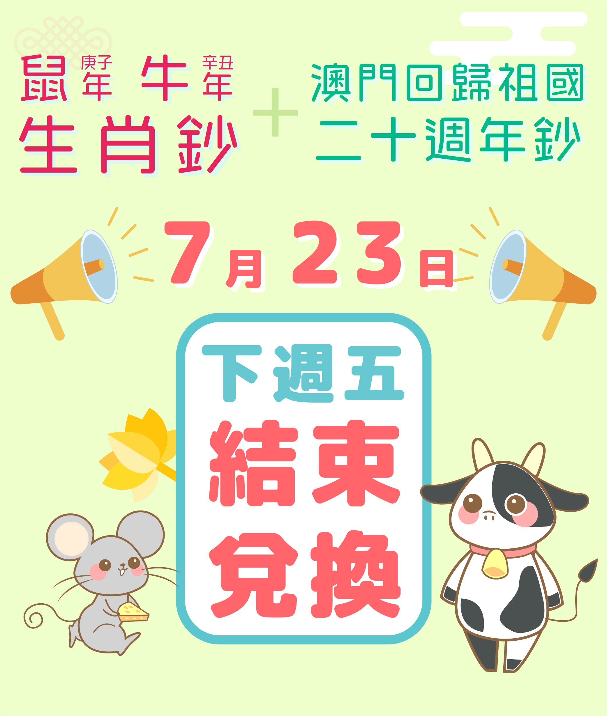 鼠年、牛年生肖鈔及澳門回歸祖國二十週年鈔 兌換期將於下週五結束