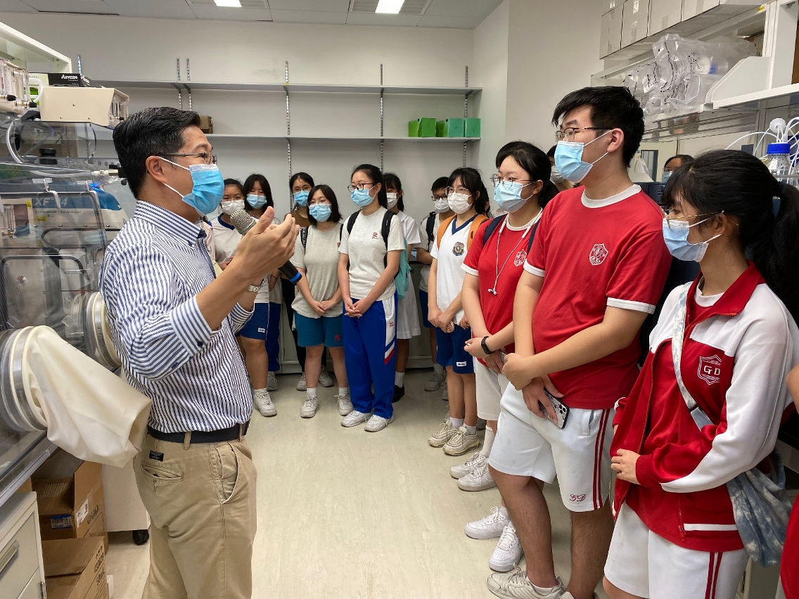 期間,40多位來自陳瑞祺(永援)中學、新華學校(中學部)、培正中學、廣大中學及濠江中學的學生在實驗室進行總菌落數檢測實驗。在健康科學學院人員的指導下,學生獨立操作整個實驗,並嚴格遵守操作規範,建立良好的實驗習慣。在健康科學學院副教授潘全威及助理教授曾華鑫的帶領下,中學生們參觀了動物實驗中心及核心實驗中心,了解中心如何培養出符合公認標準的實驗動物及利用轉基因和基因敲除的方法建立動物模型。此外,學生還參觀了學院的高端儀器,了解這些先進的設備如何助力澳大在腫瘤精準醫療研究上取得碩果累累的成績。