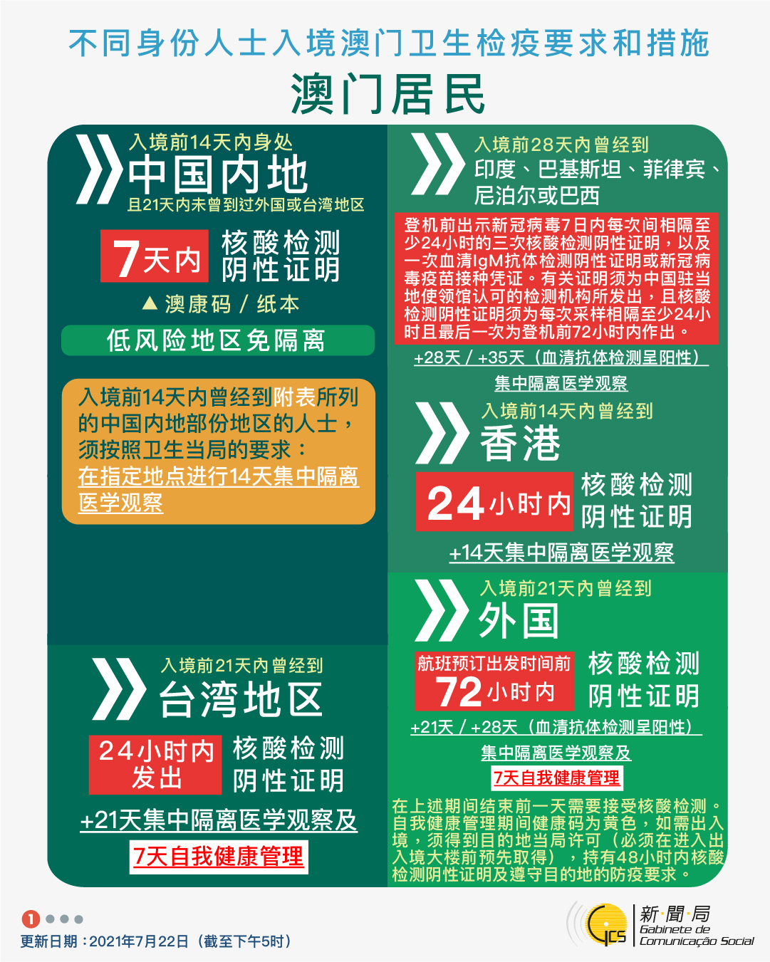 【圖文包】2021/7/22最新入境澳門衛生檢疫要求和措施