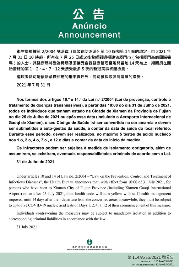 新型冠狀病毒感染應變協調中心宣佈,考慮到福建省廈門市疫情,衛生局根據第2/2004號法律《傳染病防治法》第10條和第14條的規定,自2021年7月31日早上10時起,所有在7月25日或之後曾經到過福建省廈門市(包括廈門高崎國際機場)的人士,其健康碼將變為黃碼及須接受自我健康管理至離開當地14天為止,期間須在開始措施的第1、2、4、7、12天接受最多5次的新冠病毒核酸檢測。免費核酸檢測預約連結為https://app.ssm.gov.mo/mandatoryrnatestbook。核酸檢測結果不會上載至澳門健康碼亦不可作為出入境用途。如需將核酸檢測結果在澳門健康碼顯示,則須自費檢測。