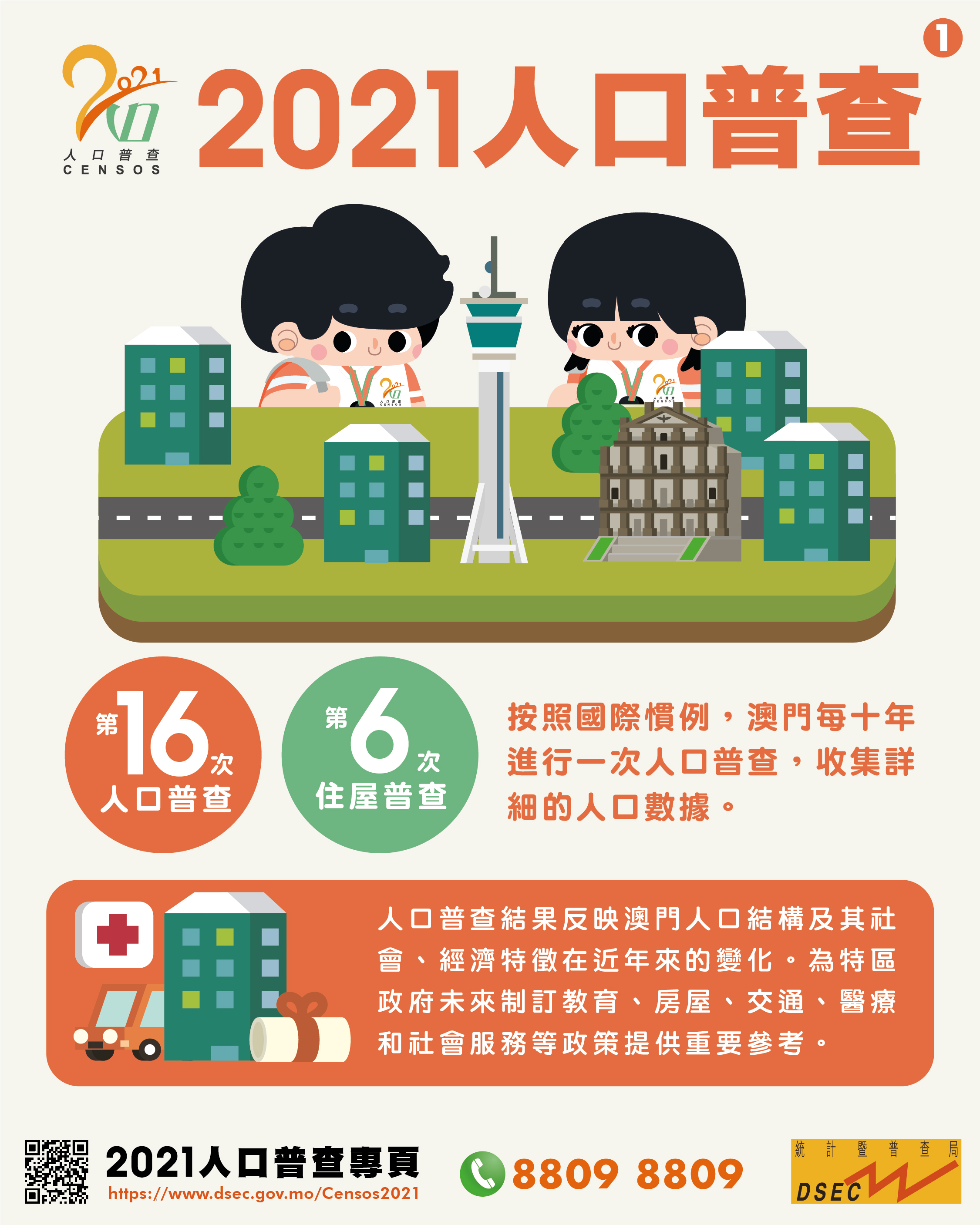 2021人口普查將於8月7日至21日進行,統計暨普查局向全澳27萬多個住宅及工商業單位收集資料。人口普查問卷分為短式及長式兩種,統計局組織了約2,200名經過培訓的工作人員,到全澳各區收集資料。