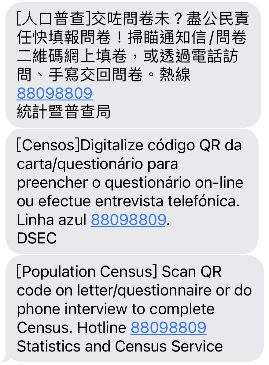 為提醒巿民盡快提交問卷,統計局會由明(13)日起陸續向全澳市民發送手機短訊,短訊內容只會呼籲市民進行網上填報、交回紙本問卷或致電普查熱線8809 8809進行電話訪問,絕不會利用手機短訊向市民索取任何資料,市民要特別留意。
