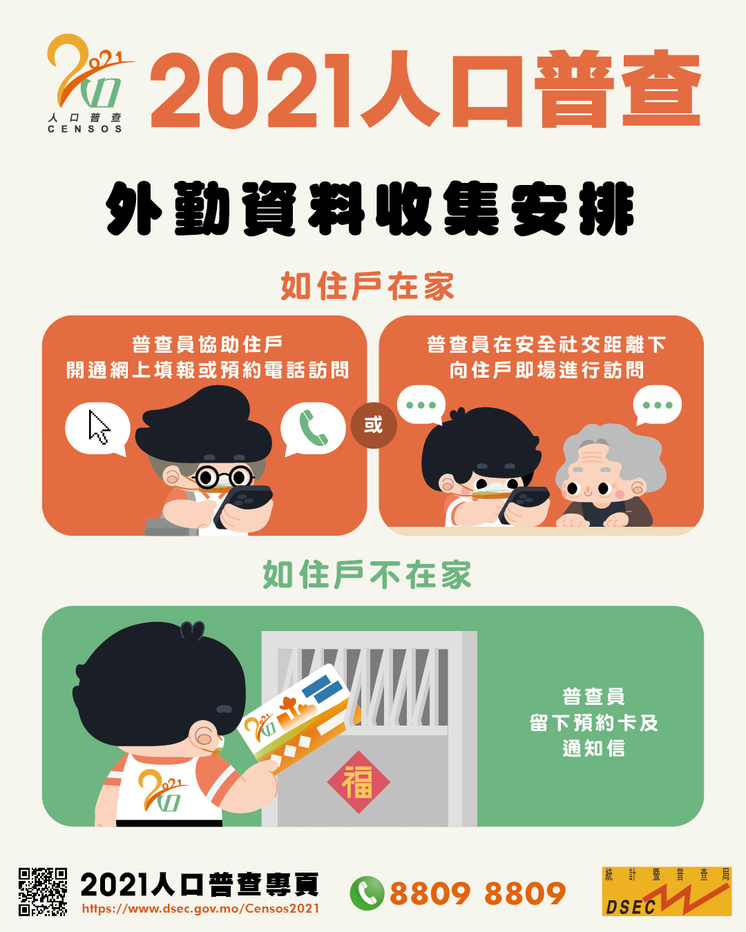 為確保人口普查工作的完成,統計暨普查局經徵詢衛生局,並在做好各項防疫措施下,把資料收集期順延7天至本月28日。同時於本月23日(周一)恢復普查員的外訪工作,安排800名普查員向未提交問卷的住戶收集資料。