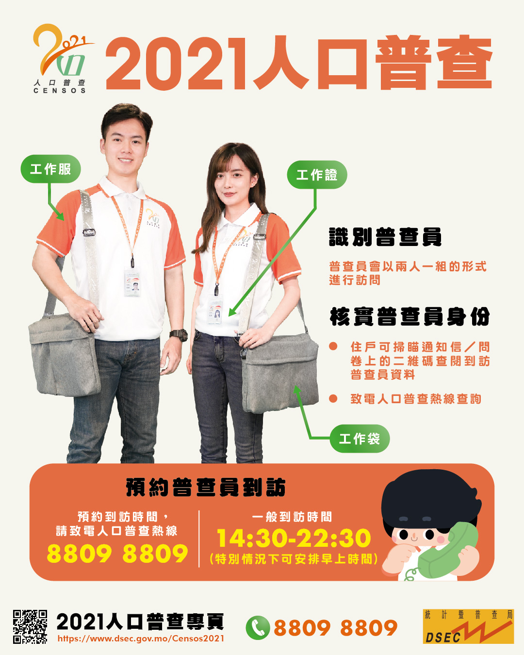 統計局呼籲全澳市民配合普查工作,履行公民責任,為澳門未來發展提供準確資料。有關人口普查詳情,請瀏覽2021人口普查專頁( https://www.dsec.gov.mo/Censos2021 ),或致電人口普查熱線8809 8809查詢。