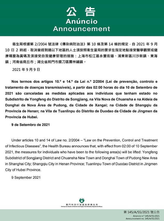 新型冠狀病毒感染應變協調中心宣佈,因應上海市、河南省和湖北省的疫情變化,衛生局根據第2/2004號法律《傳染病防治法》第10條和第14條的規定,自2021年9月10日早上2時起,取消曾經到過以下地區的人士須按照衛生當局的要求在指定地點接受醫學觀察或健康碼變為黃碼及須接受自我健康管理的措施:上海市松江區永豐街道、浦東新區川沙新鎮、東海鎮;河南省商丘市;湖北省荊門市掇刀區團林鋪鎮。