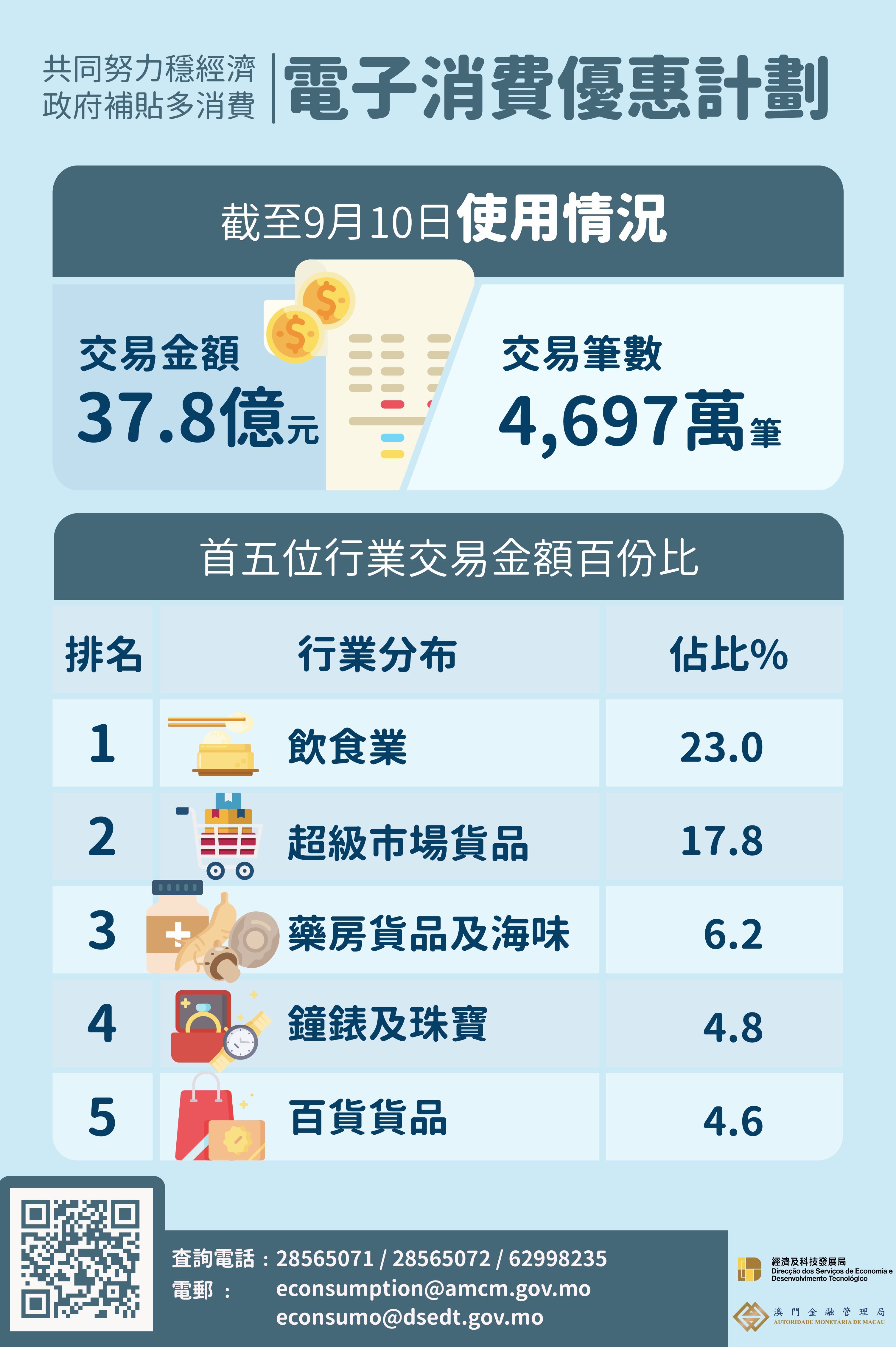 “電子消費優惠計劃”自6月1日起推行,首三個多月(截至9月10日)產生約4, 697萬筆交易,約37.8億澳門元的優惠款項(包括啟動金及立減額)已注入本地消費市場。此外,透過金融機構及商戶加推的優惠活動,進一步激發消費活力。