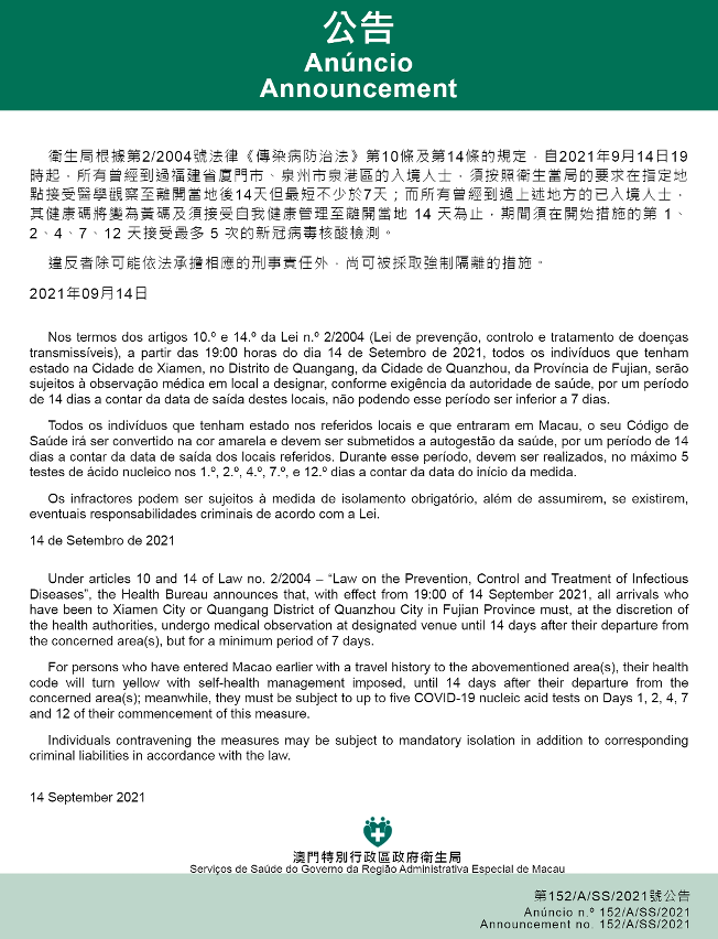 新型冠狀病毒感染應變協調中心宣佈,因應福建省的疫情變化,衛生局根據第2/2004號法律《傳染病防治法》第10條和第14條的規定,自2021年9月14日晚上7時起,所有曾經到過福建省廈門市或泉州市泉港區的入境人士,須按照衛生當局的要求在指定地點接受醫學觀察至離開當地後14天但最短不少於7天;而所有曾經到過上述地方的已入境人士,其健康碼將變為黃碼及須接受自我健康管理至離開當地 14 天為止,期間須在開始措施的第 1、2、4、7、12 天接受最多 5 次的新冠病毒核酸檢測。免費核酸檢測預約連結為https://app.ssm.gov.mo/mandatoryrnatestbook。核酸檢測結果不會上載至澳門健康碼亦不可作為出入境用途。如需將核酸檢測結果在澳門健康碼顯示,則須自費檢測。