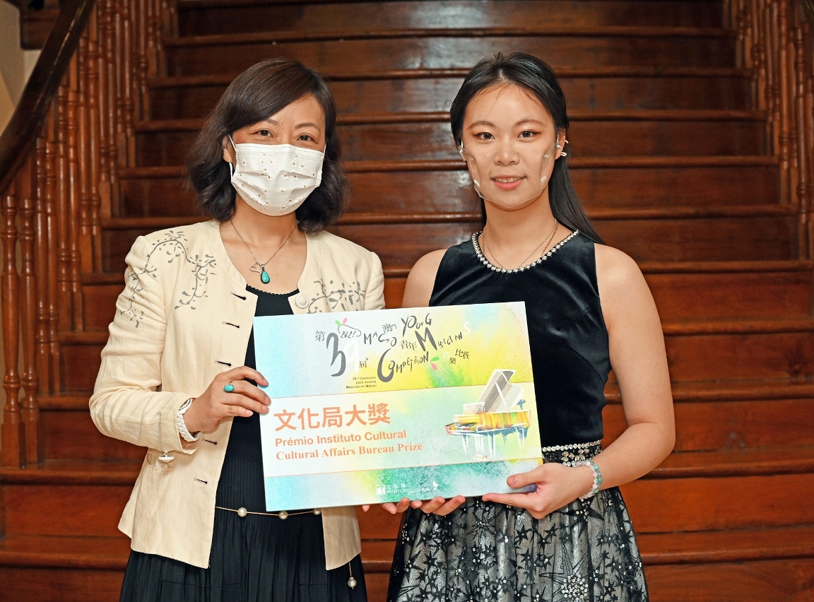 文化局“第三十九屆澳門青年音樂比賽”日前進行了頒獎儀式,向四項特別大奬得主頒發獎項,本屆《文化局大奬》由蔡朗珵獲得。文化局局長穆欣欣、演藝發展廳廳長余慧敏及演藝活動處處長曹偉妍出席進行頒獎,比賽圓滿結束。