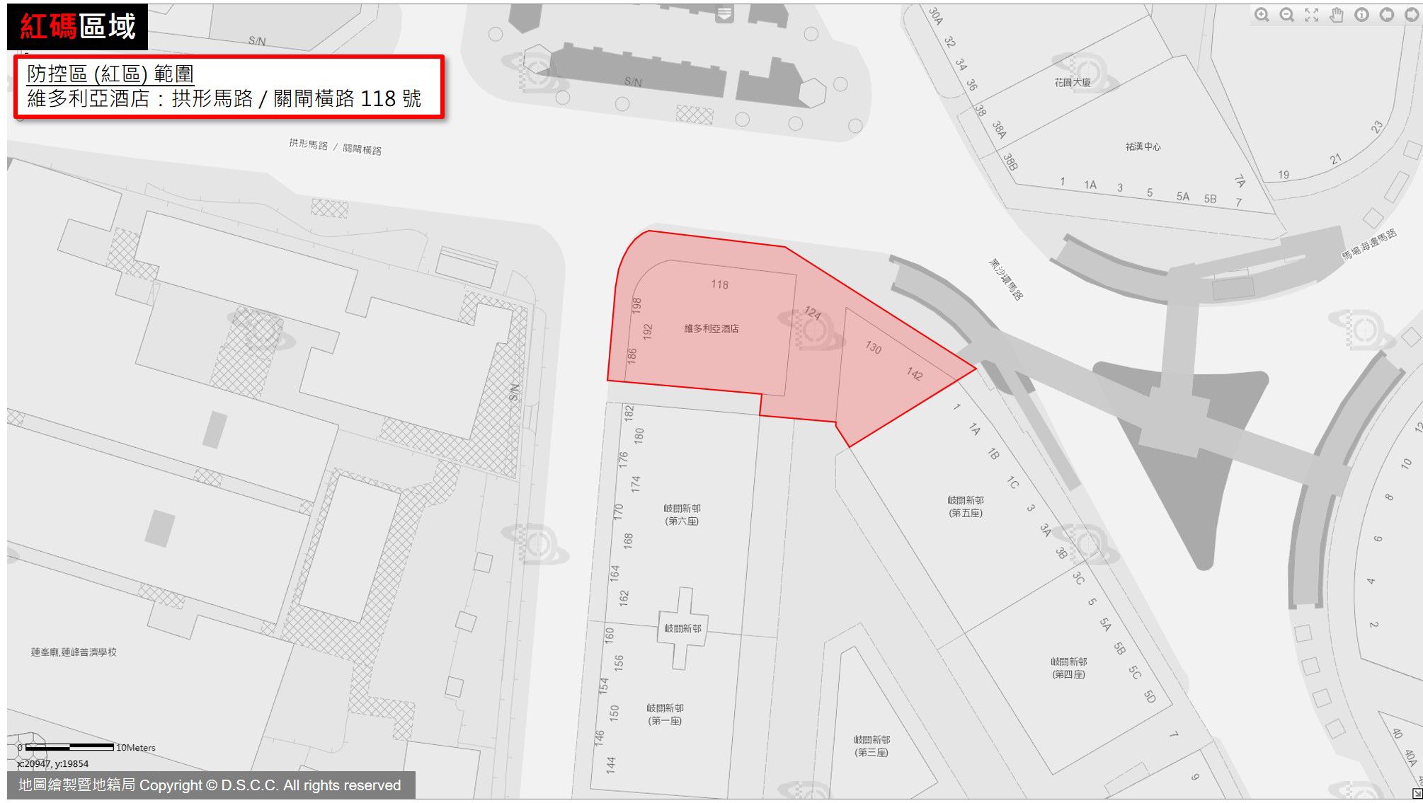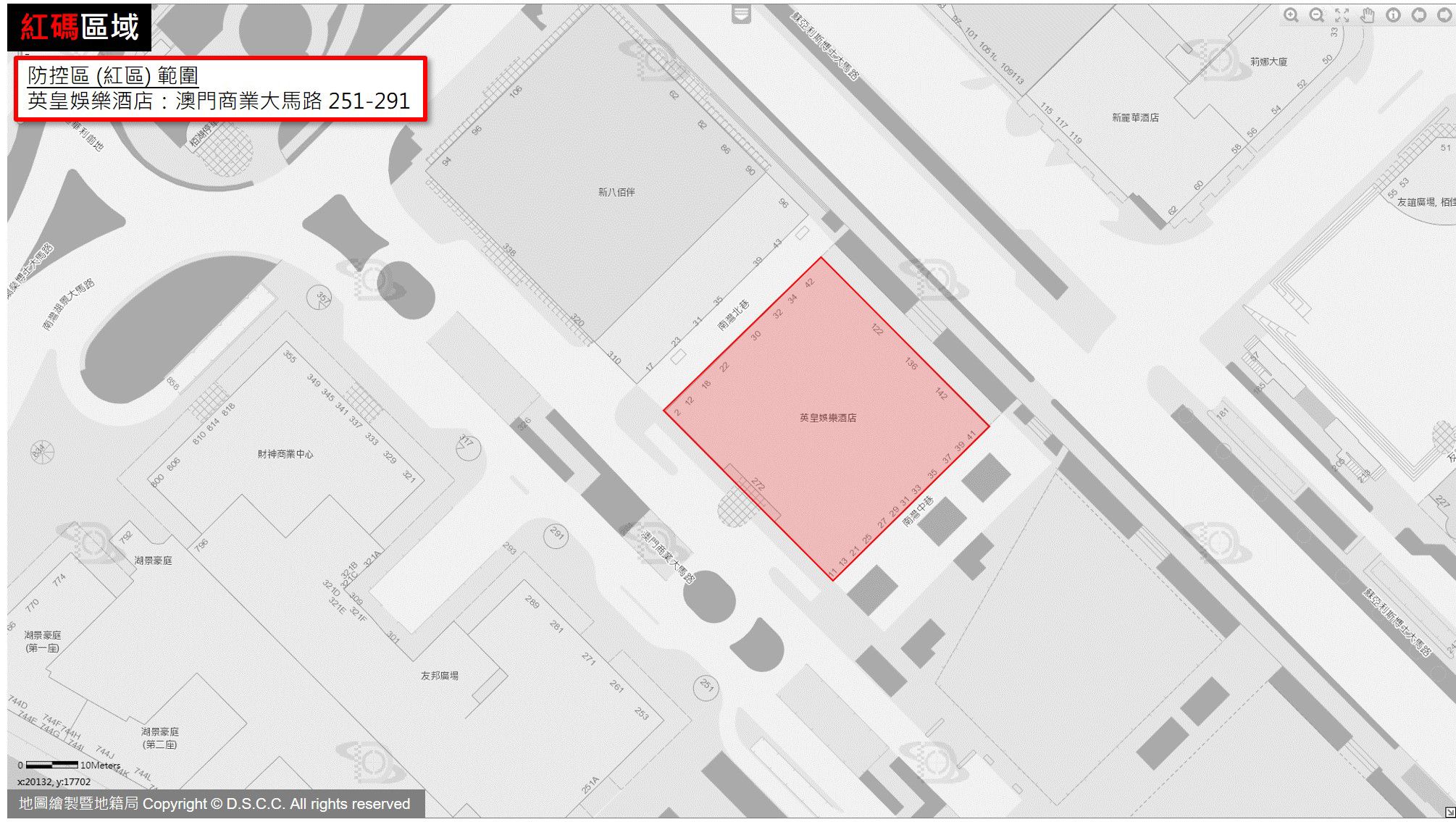 新增紅碼區範圍包括:高地烏街44-44A號金多利花園、澳門商業大馬路251-291英皇娛樂酒店、拱形馬路/關閘橫路118號維多利亞酒店。管制措施包括就地進行核酸檢測,及後每日做核酸檢測,除工作人員外,其餘人士只准進入不准外出,只能最低限度活動,例如在指定地點領取配給品;實行全限制封閉式管理,並根據實際情況就地隔離醫學觀察或轉移至適當地點接受集中管理醫學觀察。