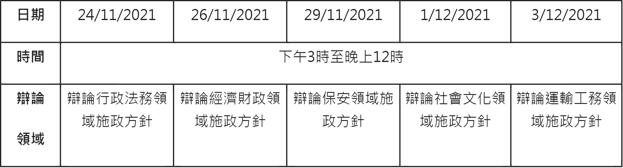 至於各領域施政方針的立法會辯論會議,日程分別是: 11月 24日辯論行政法務領域、26日辯論經濟財政領域、29日辯論保安領域、12月 1日辯論社會文化領域,以及 12月 3日辯論運輸工務領域施政方針。