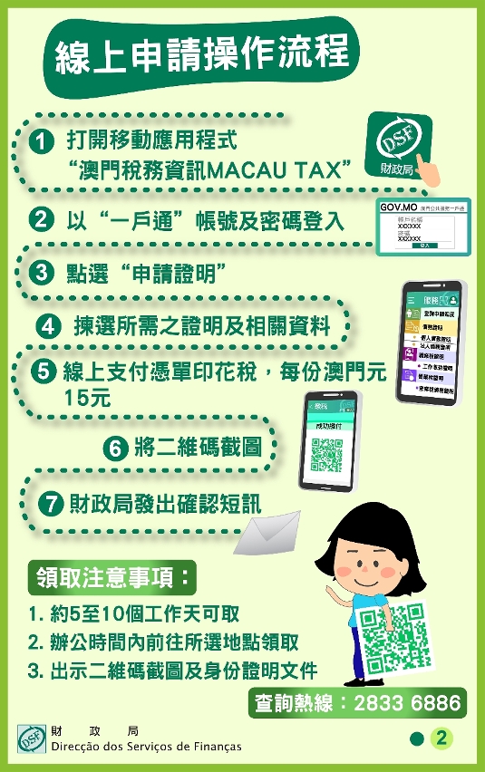 市民只需使用“一戶通” 帳號及密碼登入財政局移動應用程式“澳門稅務資訊Macau Tax”,按序點選申請證明的所需資料、申請份數,揀選領取地點,並透過政付通平台、大西洋銀行(BNU APP)或MPay任一電子支付方式線上支付申請證明需繳納的每份澳門元15元憑單印花稅,便會即時收到由財政局發出的確認短訊。