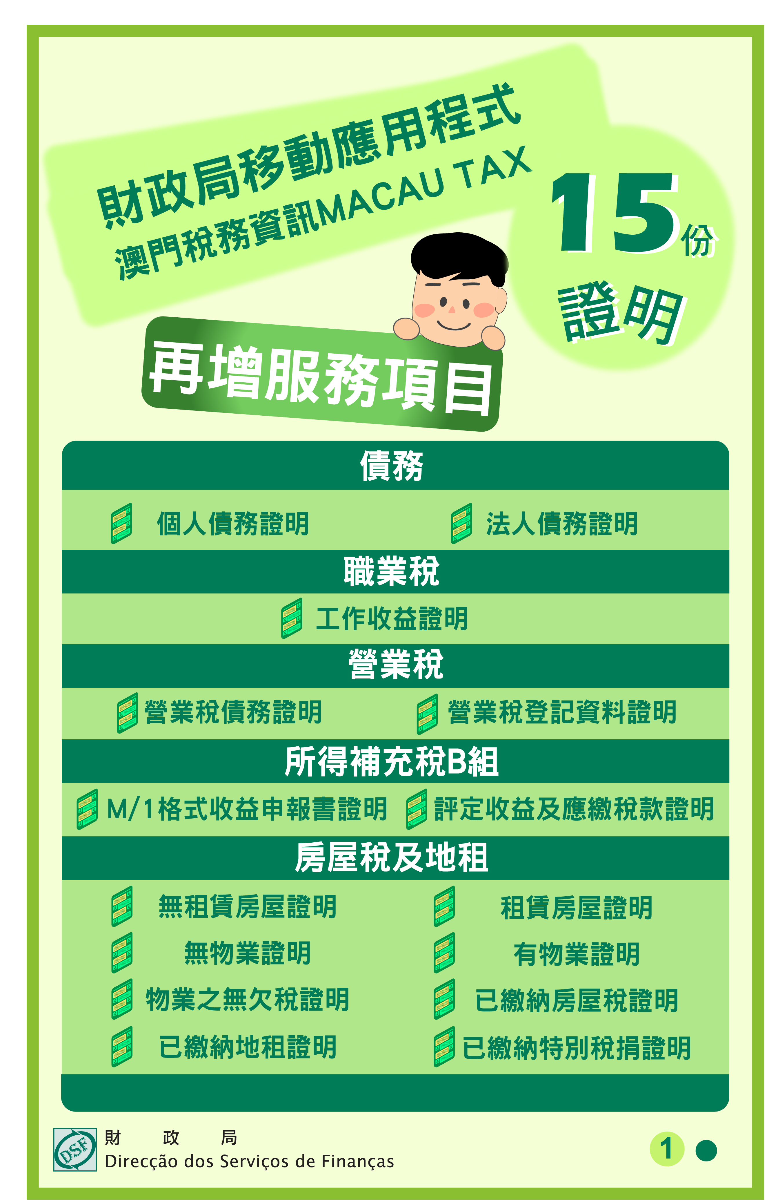 為配合電子政務發展,提供更多元化的便民服務,財政局持續優化移動應用程式“澳門稅務資訊Macau Tax”,市民現可透過該移動應用程式線上申請的證明書增至15項,涉及稅項包括:職業稅、營業稅、所得補充稅B組、房屋稅及地租,而債務證明亦包含其中。