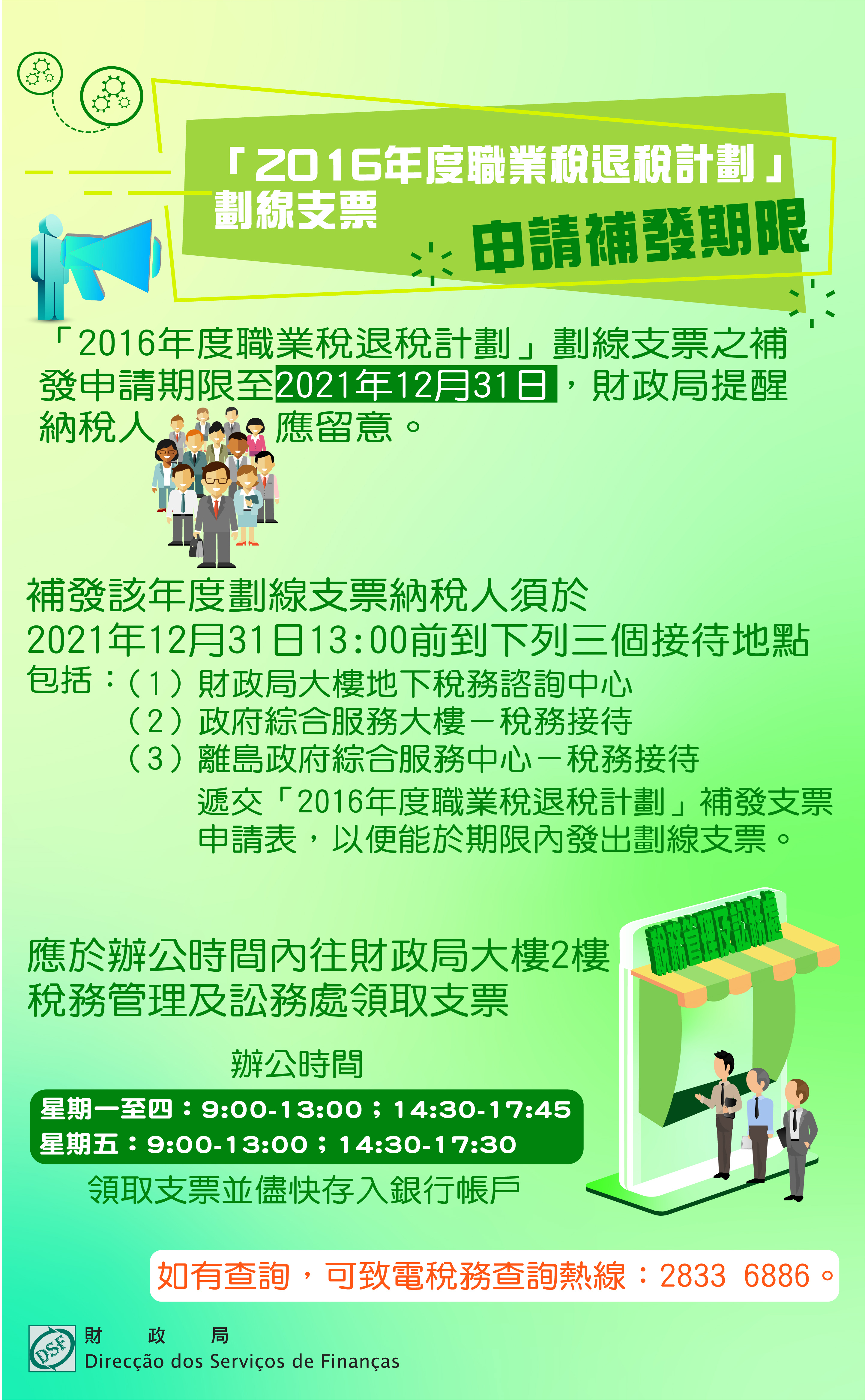 補發該年度劃線支票,納稅人須於2021年12月31日13:00前,到下列三個接待地點,包括:(1)財政局大樓地下稅務諮詢中心、(2)政府綜合服務大樓-稅務接待、(3)離島政府綜合服務中心-稅務接待,遞交「2016年度職業稅退稅計劃」補發支票申請表,以便能於期限內發出劃線支票。