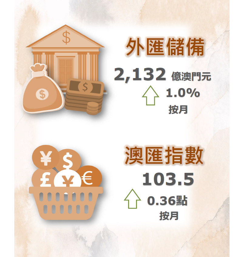 澳門金融管理局今日公佈,2021年10月底澳門特別行政區的外匯儲備資產總額,初步統計為2,132億澳門元(266.1億美元),較2021年9月經修訂總額2,110億澳門元(263.1億美元),上升了1.0%。2021年10月底的外匯資產總額,約相當於2021年9月底澳門流通貨幣的11倍或廣義貨幣供應(M2)中屬於澳門元部份的88.4%。