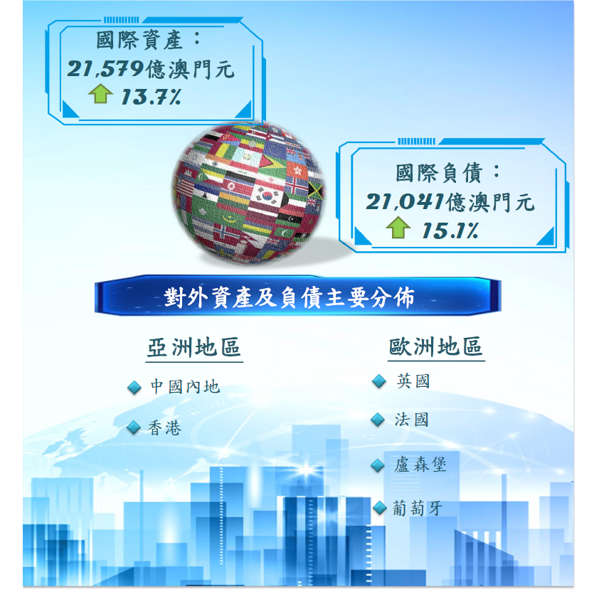 至2021年9月底,澳門銀行的國際資產總額按季下跌0.9%,而按年則增加13.7%,金額為21,579億澳門元(2,691億美元);其中,對外資產按年上升15.9% 至16,393億澳門元,而本地外幣資產亦增長7.3%,金額為5,186億澳門元。作為國際資產主要組成部份的外地非銀行貸款增加13.9%,金額達7,502億澳門元。