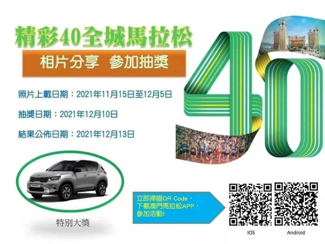 「精彩40全城馬拉松」相片分享參加抽獎活動歡迎有興趣人士參加,參加者可於11月15日至12月5日期間拍攝「2021 銀河娛樂澳門國際馬拉松」的相關相片,上載至個人的任何社交平台,並將有關帖文的截圖上載至 www.macaomarathon.com/zh/fab40 或「澳門國際馬拉松」手機應用程式 ,填上個人資料, 即可參加抽獎。中獎者有機會獲得房車、酒店住宿、餐飲禮券及電影門票等豐富獎品。