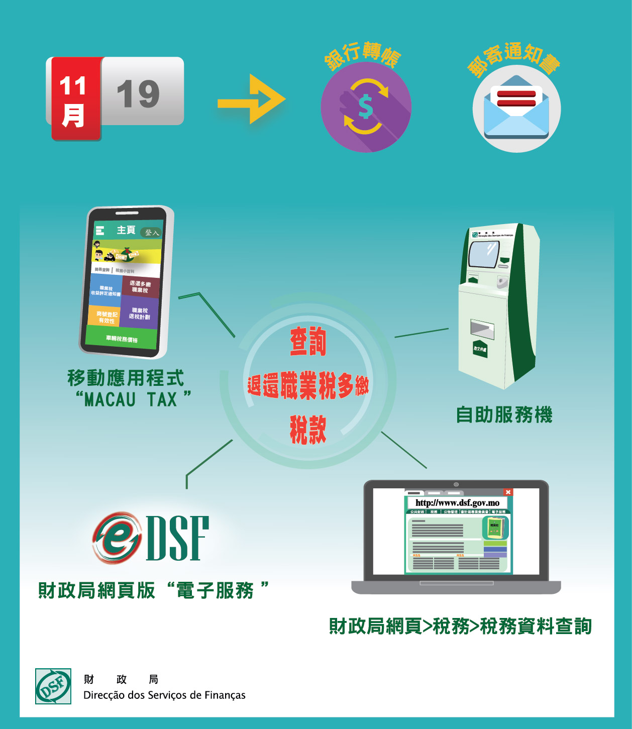 納稅人可透過自助服務機,或以「一戶通」帳號登入財政局「電子服務」系統、移動應用程式「澳門稅務資訊Macau Tax」,又或者於財政局網頁( www.dsf.gov.mo )稅務欄內之「稅務資料查詢」,查閱有關職業稅退稅資料。財政局呼籲曾多繳2020年度職業稅的納稅人留意,並使用上述查詢方式暸解退稅情況。