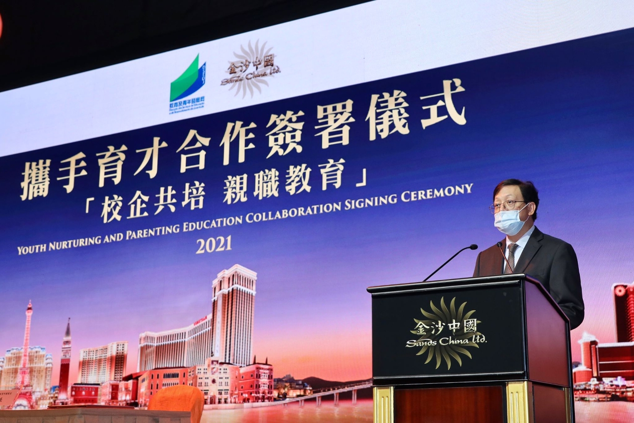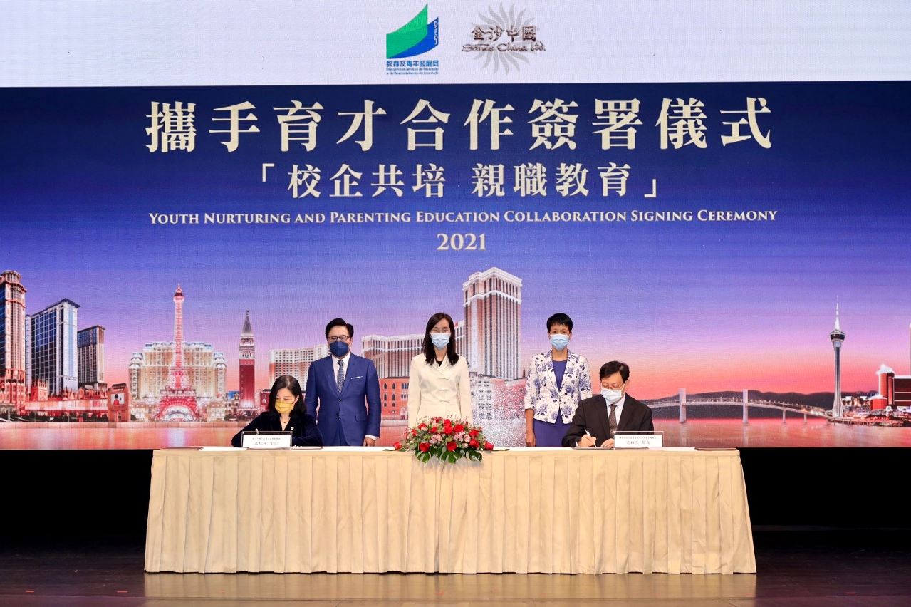 在社會文化司司長歐陽瑜、威尼斯人澳門股份有限公司總裁兼執行董事王英偉博士及中央人民政府駐澳門特別行政區聯絡辦公室教育與青年工作部部長徐婷的見證下,教青局局長老柏生和威尼斯人人力資源部高級副總裁文紅燕於2021年11月18日簽訂兩項合作意向書,分別涉及職業技術教育和親職教育的相關工作。