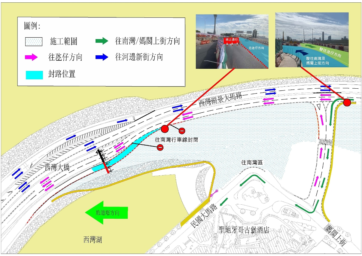 為配合西灣湖景大馬路近西灣大橋口位置交通設備(龍門架)的復原工作,現定於11月29日(周一)及11月30日(周二)凌晨2點至5點短暫封閉相關路段並進行施工。屆時,西灣湖景大馬路往南灣方向的車輛需取道媽閣上街,再轉入民國大馬路前往南灣區,敬請駕駛者留意。詳見附圖