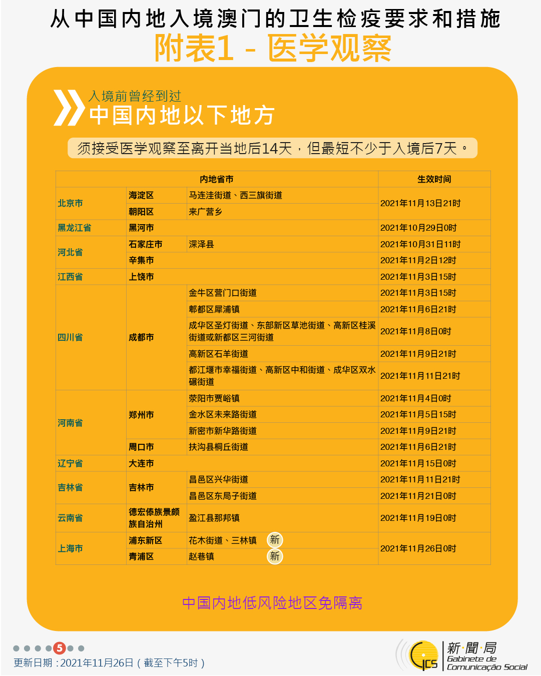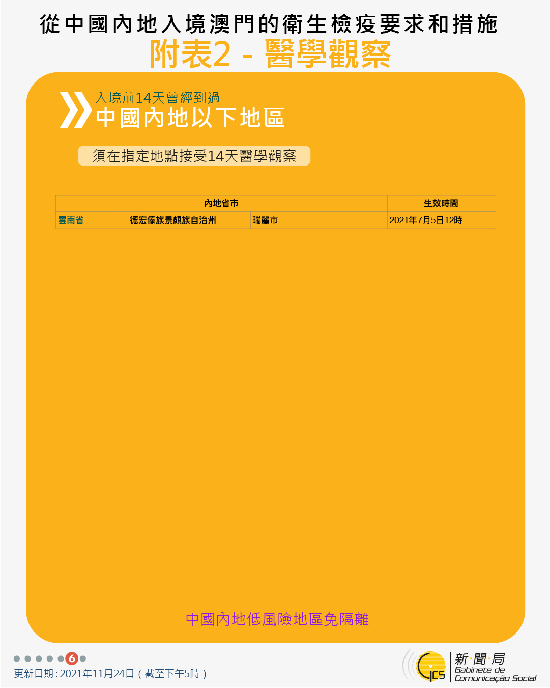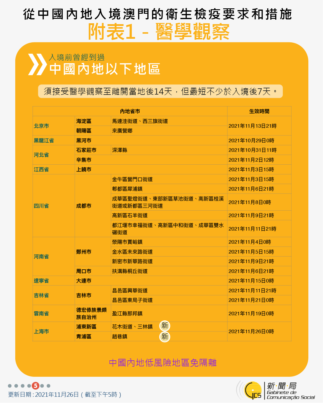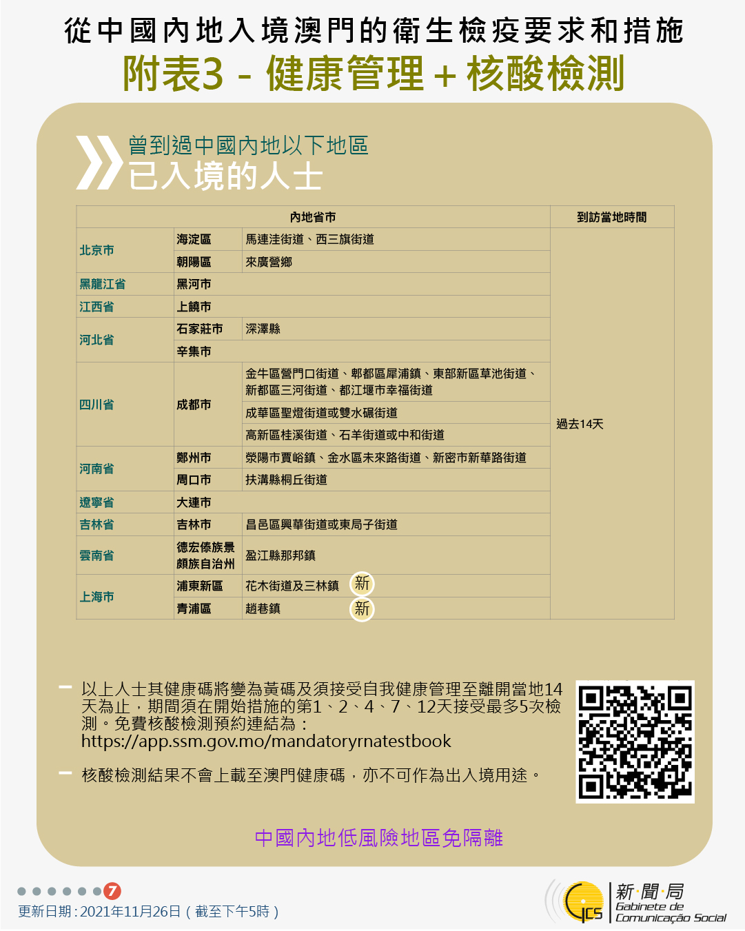 11月27日零時起新增曾到浙江省及江蘇省相關區域人士的防疫措施及取消曾到內地多個省市人士的防疫措施