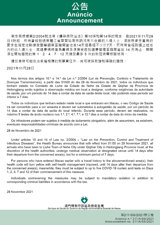 新型冠狀病毒感染應變協調中心(下稱“應變協調中心”)宣佈,因應黑龍江省的疫情變化,衛生局根據第2/2004號法律《傳染病防治法》第10條和第14條的規定,自2021年11月29日早上1時起,所有曾經到過黑龍江省齊齊哈爾市訥河市六合鎮的入境人士,須按照衛生當局的要求在指定地點接受醫學觀察至離開當地後14天但最短不少於7天。而所有曾經到過上述地方的已入境人士,其健康碼將變為黃碼及須接受自我健康管理至離開當地 14 天為止,期間須在開始措施的第 1、2、4、7、12 天接受最多 5 次的新冠病毒核酸檢測。免費核酸檢測預約連結為 https://app.ssm.gov.mo/mandatoryrnatestbook 。核酸檢測結果不會上載至澳門健康碼亦不可作為出入境用途。如需將核酸檢測結果在澳門健康碼顯示,則須自費檢測。