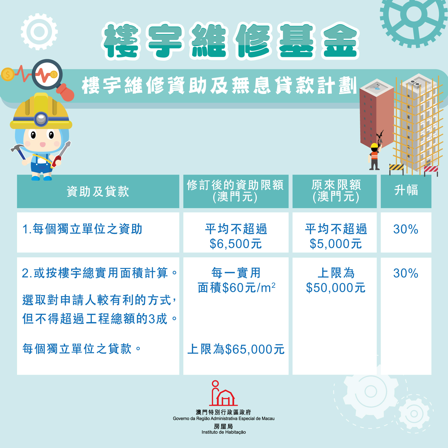 《樓宇維修基金》透過第4/2007號行政法規設立,目的對有助澳門私人樓宇安全及環境衛生的保養及維修工程提供資助。截至2021年11月19日,各項計劃累計批出4,982宗申請,涉及資助金額達4億8千多萬元。