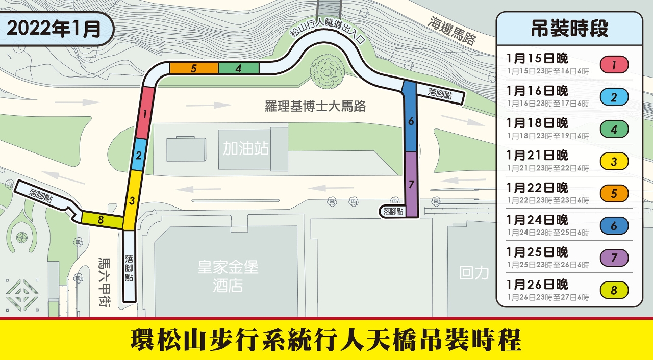 松山行人隧道南端出入口位於羅理基博士大馬路,目前正建造兩組行人天橋,一組連接馬六甲街,另一組連接至回力與皇家金堡酒店之間的行人路;天橋落腳點的樁基礎工程曾因與現有管線衝突問題而有所延誤,經過調整部分落腳點設計後,基礎工程正陸續完成,明起可分段吊裝鋼結構橋身,首段先安裝加德士油站近松山一段,吊裝時段由晚上11時至翌日清晨6時進行,屆時實施臨時交通措施,一段羅理基博士大馬路封閉交通。橋身吊裝工程分八段進行,全部安排於凌晨至清晨時段施工,爭取春節前完成。