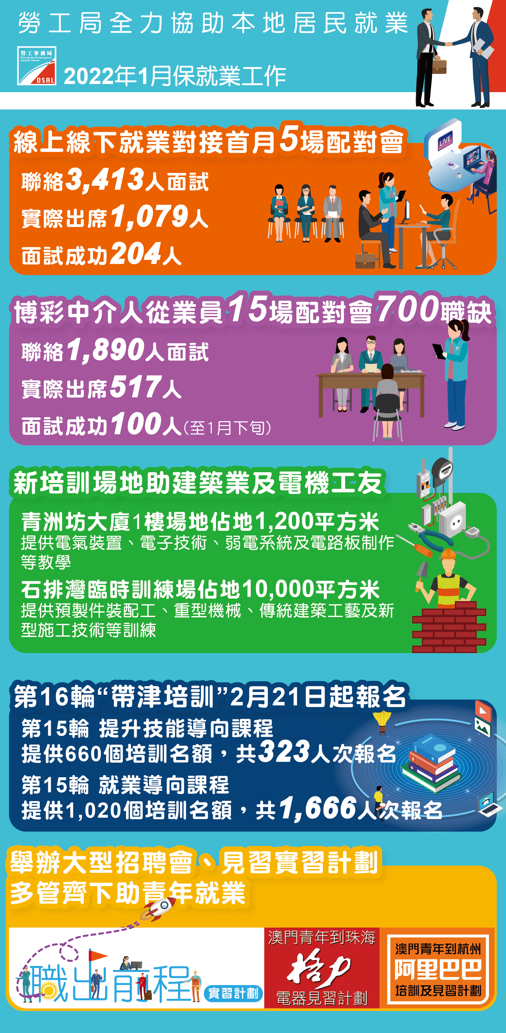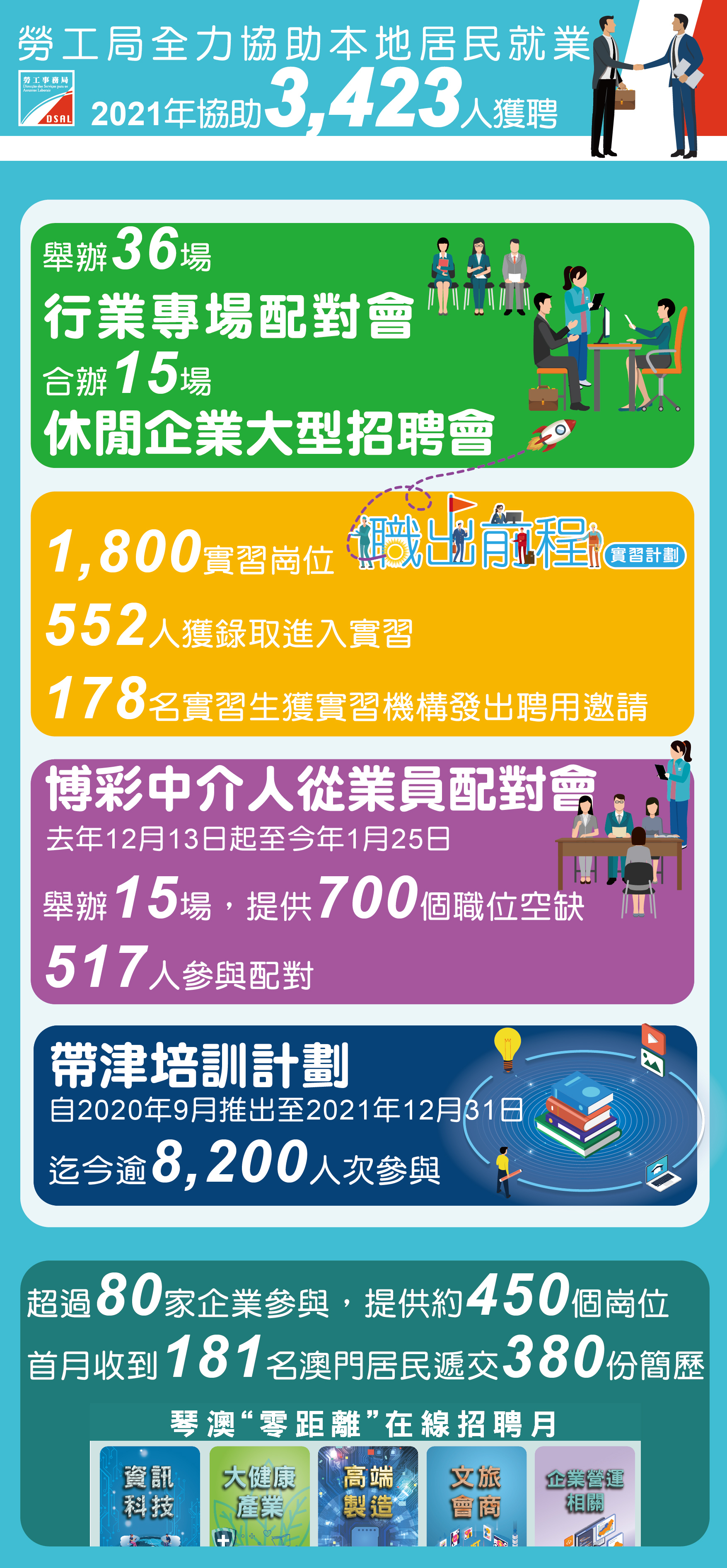 勞工局以恆常配對、行業專場配對會及大型企業招聘會等措施促進就業市場供需平衡,積極穩定本地居民優先就業,2021年全年累計共協助3,423人成功就業。