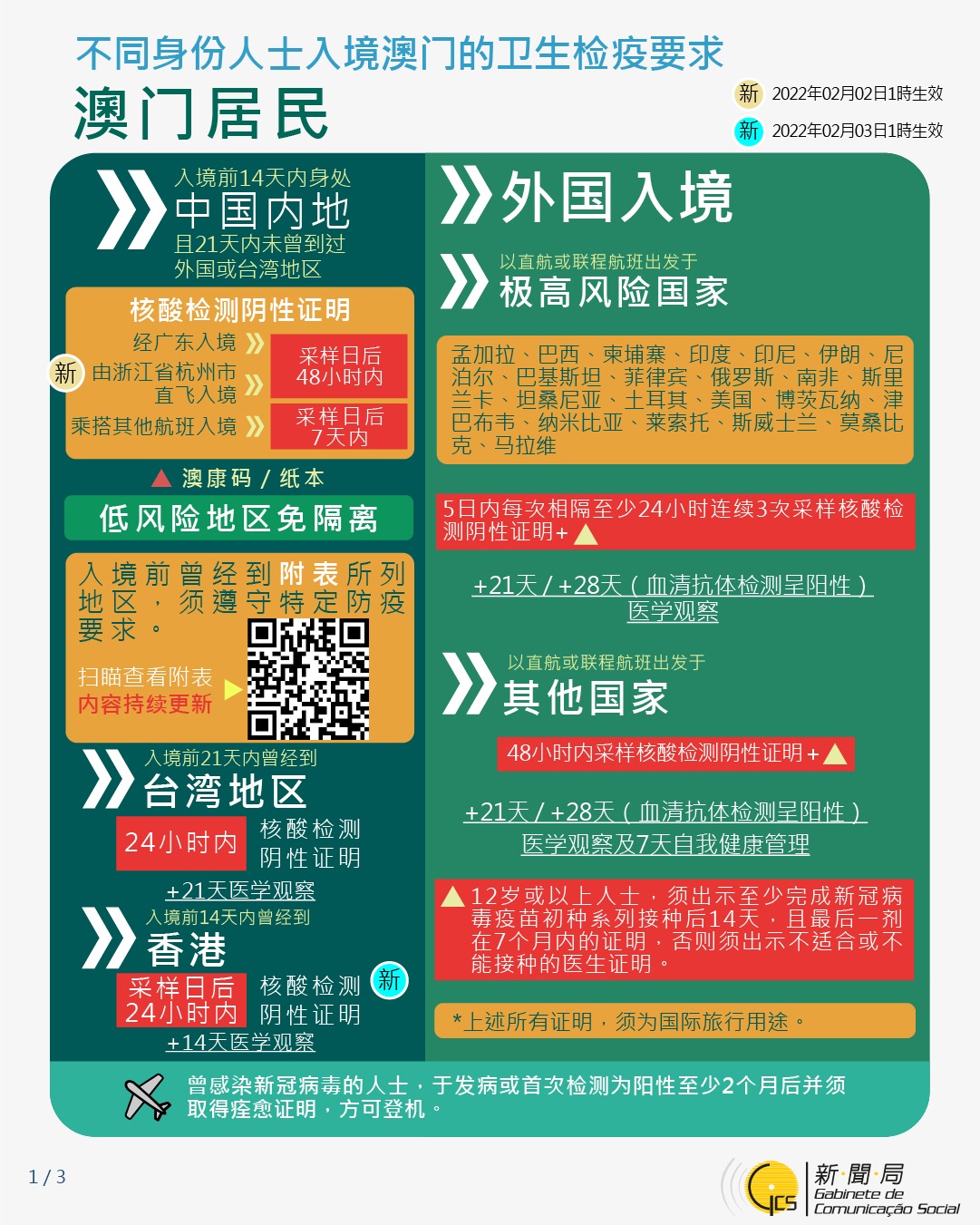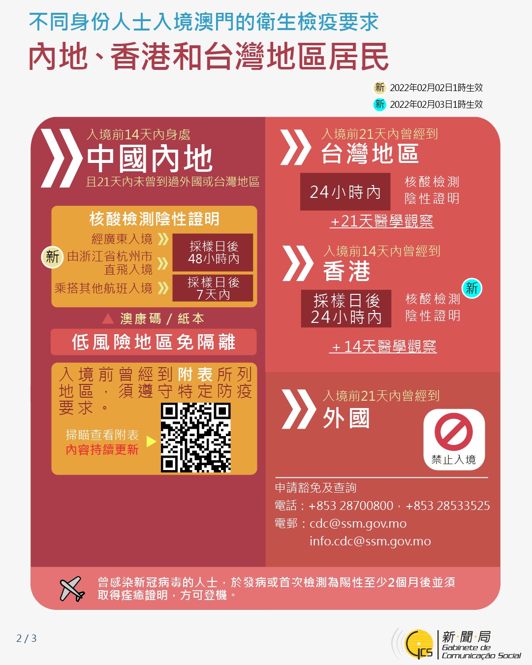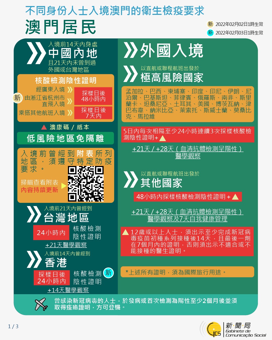 【圖文包】2022/2/1最新入境澳門衛生檢疫要求