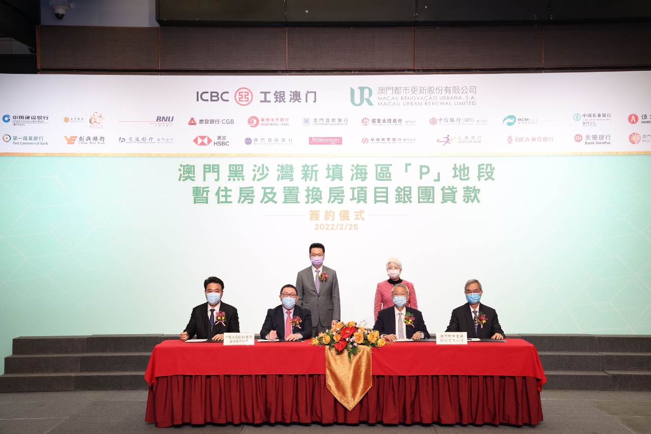 「黑沙灣新填海區『P』地段暫住房及置換房項目銀團貸款簽約儀式」今(25日)舉行,澳門都市更新股份有限公司(下稱:都更公司)與中國工商銀行(澳門)股份有限公司(下稱:工銀澳門)代表簽署合同,以銀團貸款融資方式建設項目。