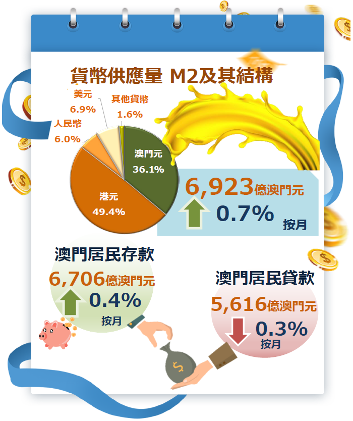 居民存款較上月上升0.4%至6,706億澳門元,非居民存款亦增加8.1%至3,831億澳門元。另一方面,公共部門在銀行體系的存款下跌0.8%至2,624億澳門元。綜合計算,銀行體系的存款總額較上月增加2.3%至13,161億澳門元;當中,澳門元、港元、人民幣及美元所佔的比重分別為19.0%、50.3%、6.3%及22.8%。