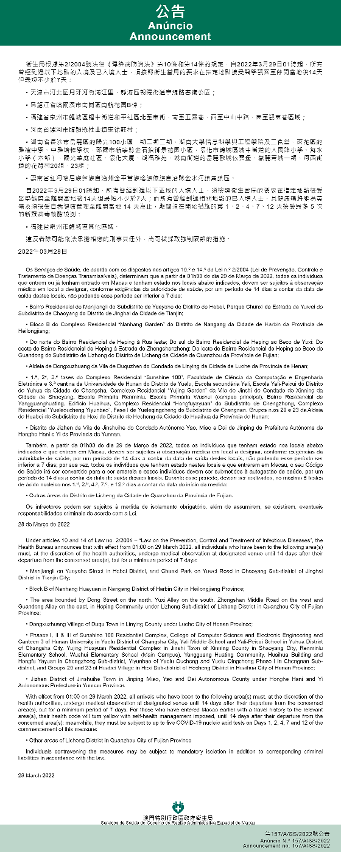 新型冠狀病毒感染應變協調中心(下稱應變協調中心)宣佈,因應內地的疫情變化,衛生局根據第2/2004號法律《傳染病防治法》第10條和第14條的規定,自2022年3月29日凌晨1時起,所有曾經到過以下地點的入境及已入境人士,須按照衛生當局的要求在指定地點接受醫學觀察至離開當地後14天但最短不少於7天:天津市河北區月牙河街滿江里,靜海區朝陽街道宇緯路春曦公園;黑龍江省哈爾濱市南崗區南航花園B棟;福建省泉州市鯉城區鯉中街道和平社區北至東街、南至玉犀巷、西至中山中路、東至觀東巷區域;河南省漯河市臨潁縣杜曲鎮東徐莊村;湖南省長沙市岳麓區的陽光100小區一期二期三期、湖南大學信息科學與工程學院及三食堂、雨花區的雅禮中學、中雅培粹學校,邵陽市新寧縣金石鎮御景花園小區,懷化市鶴城區城中街道的人民路小學、舞水小學(本部)、陽光華庭社區、懷化大廈、鴻福雅苑、城南街道的岳麓歐城依雲堡、嶽麓青城一期、河西街道的花背村20組、23組;雲南省紅河哈尼族彝族自治州金平苗族瑤族傣族自治縣金水河鎮集鎮區。