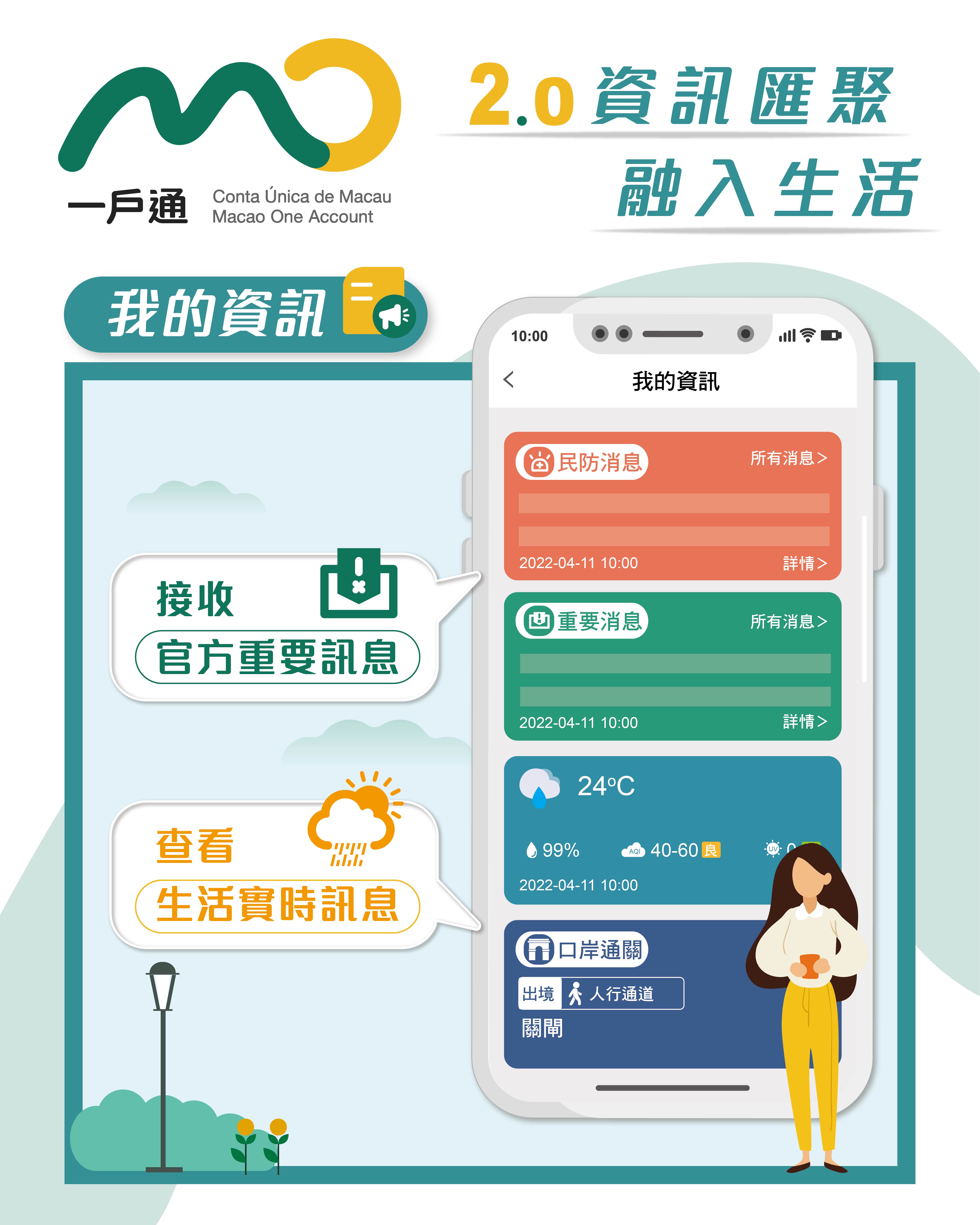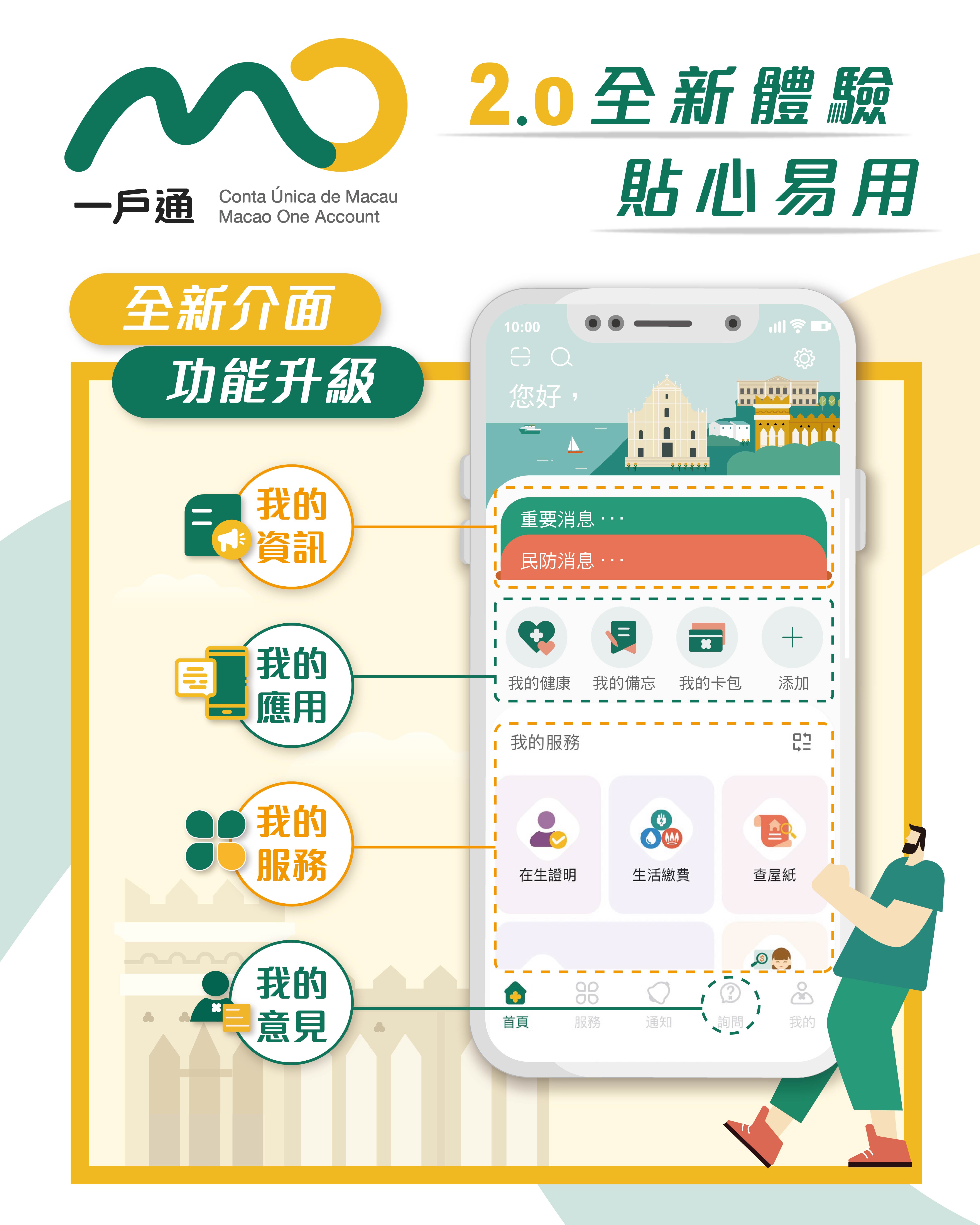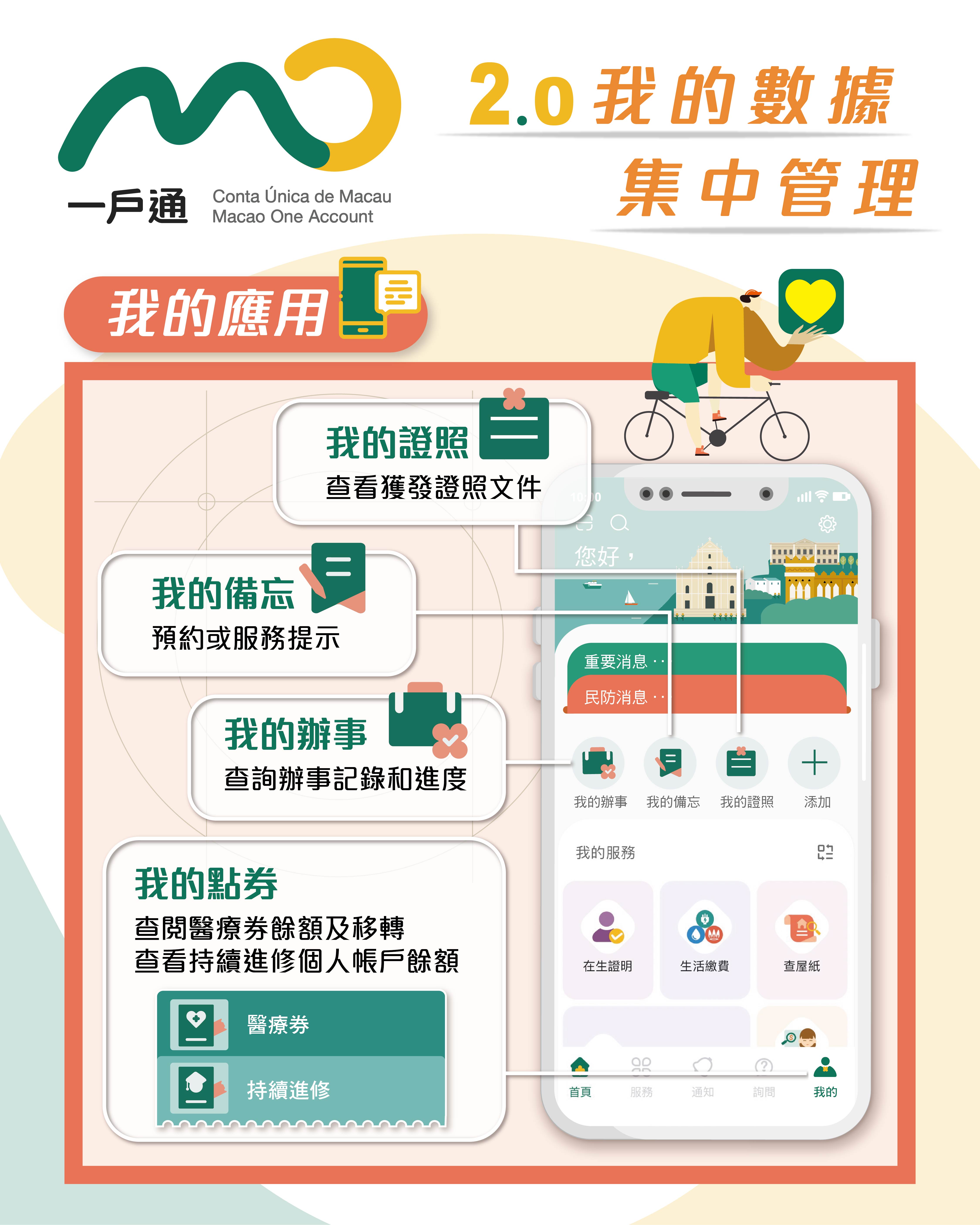 為回應社會對於便捷電子服務的需求,特區政府持續優化“一戶通”手機應用程式和網頁版,於今天(4月11日)正式推出全面升級的2.0版本。“一戶通"2.0以“用戶導向、優化體驗、便民服務"為核心,通過系統重構、清晰佈局,為市民大眾帶來全新體驗。“一戶通"2.0的上線,標誌着跨範疇多部門共同合作的成果,推動特區電子政務發展踏上新台階,同時亦為建設智慧城市再向前邁進一步。