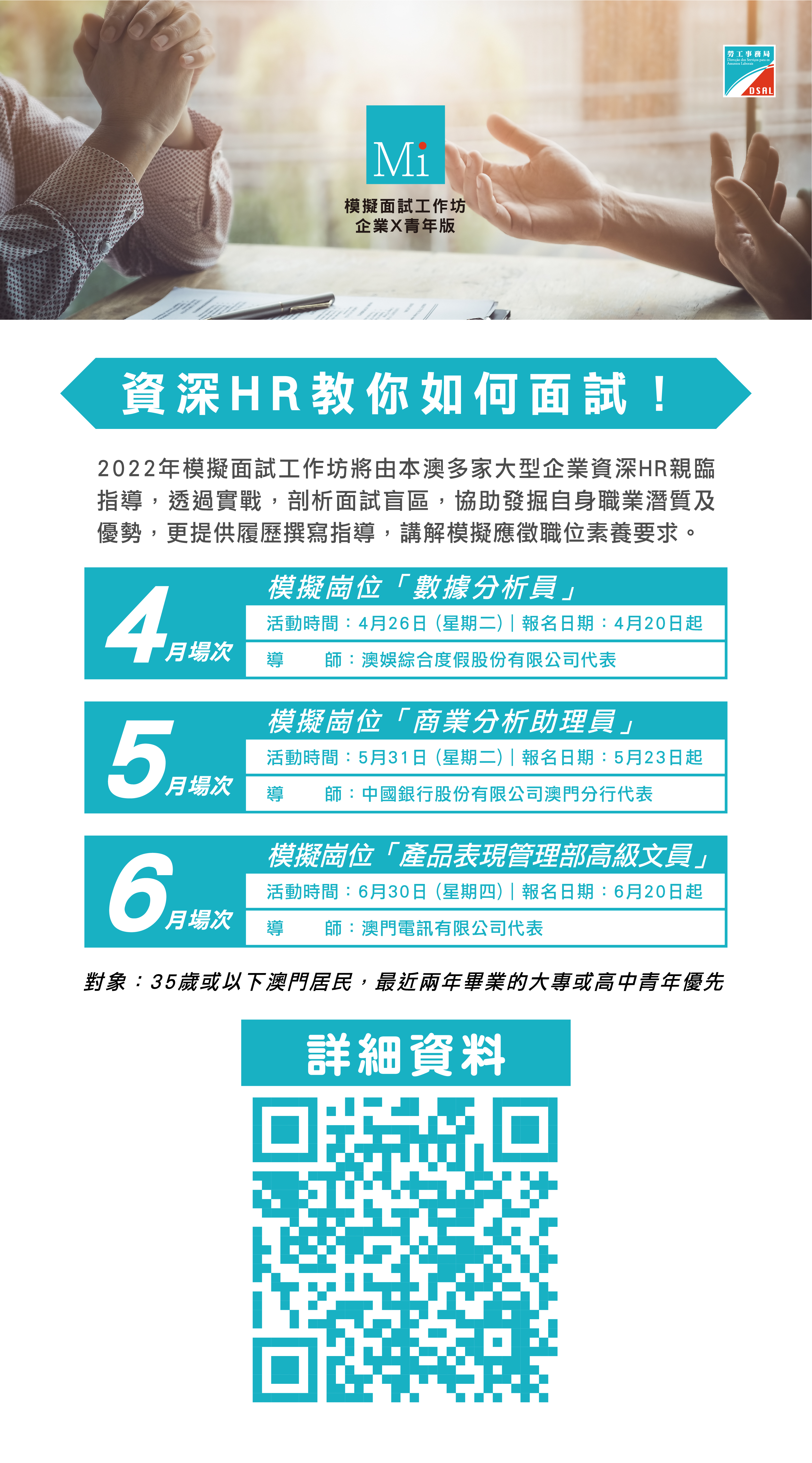 “模擬面試工作坊”專頁:https://www.dsal.gov.mo/zh_tw/standard/mock_interview_workshop.html
