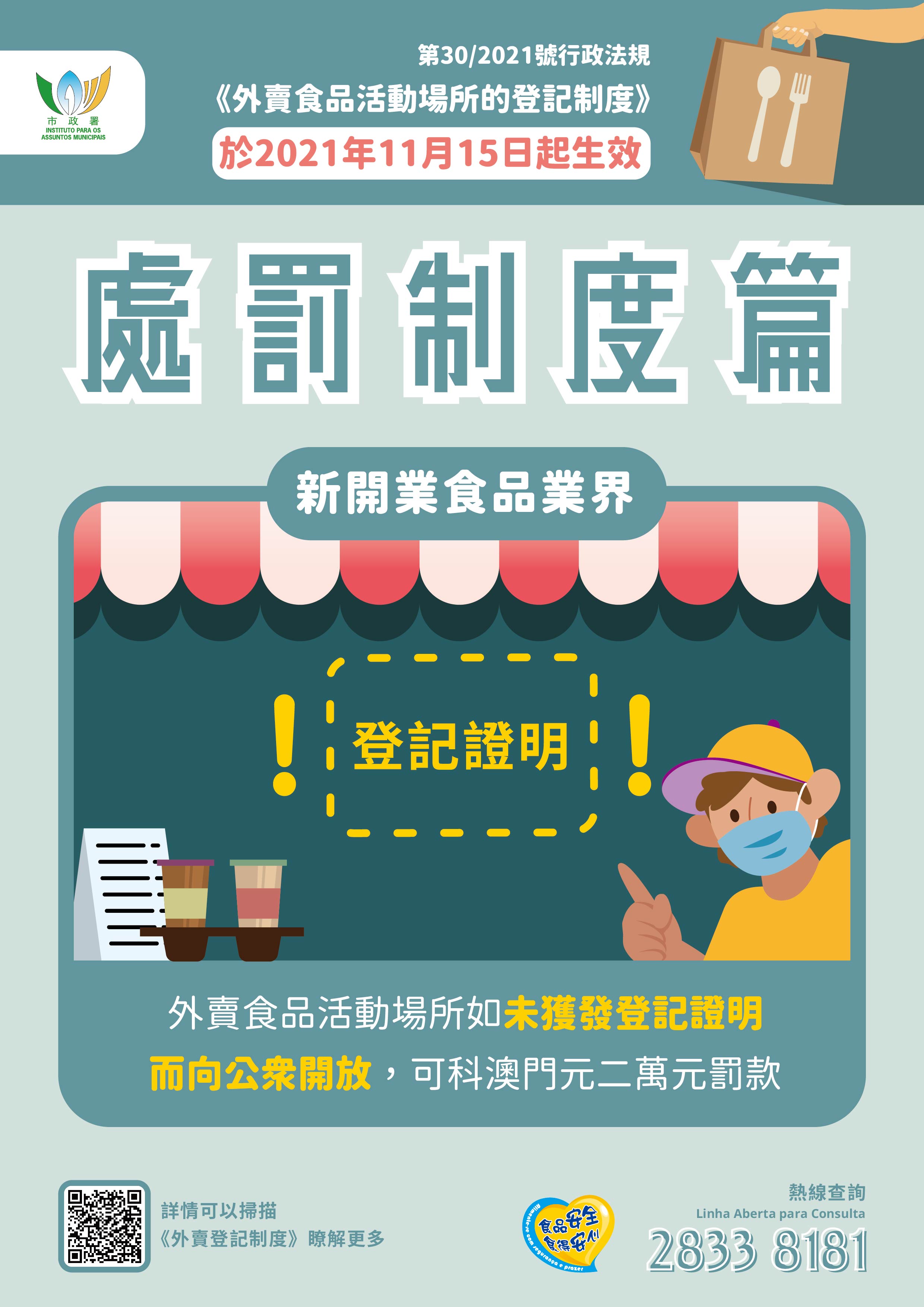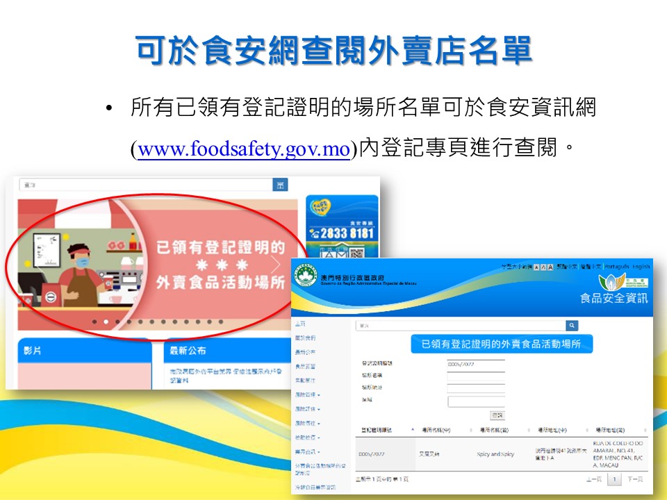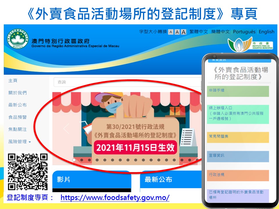 更多登記制度及食安資訊詳情,可瀏覽市政署食安資訊網 www.foodsafety.gov.mo 或手機應用程式內的“外賣食品活動場所的登記制度”專頁,亦可致電食安專線2833 8181查詢。