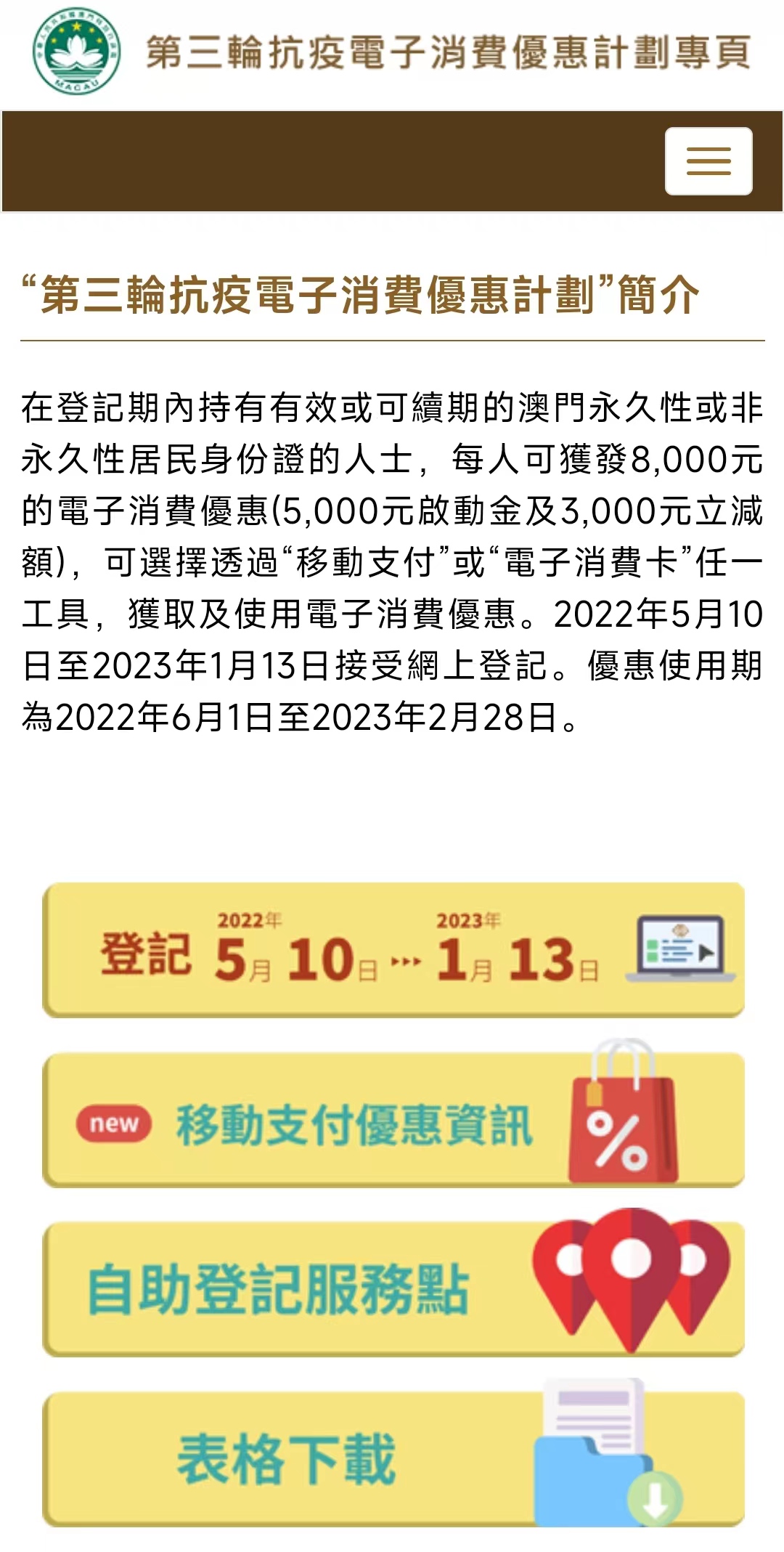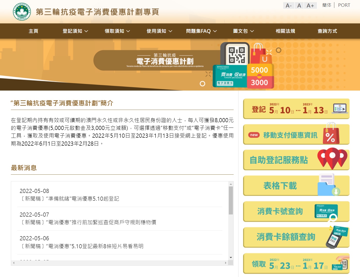 合資格澳門居民由早上9時起,可到澳門金融管理局網頁( https://registration.amcm.gov.mo/econsumption/terms_zh.html )登記以“實名認證的移動支付”或“電子消費卡”任一方式,領取5,000元啟動金及3,000元立減額的“第三輪抗疫電子消費優惠”。