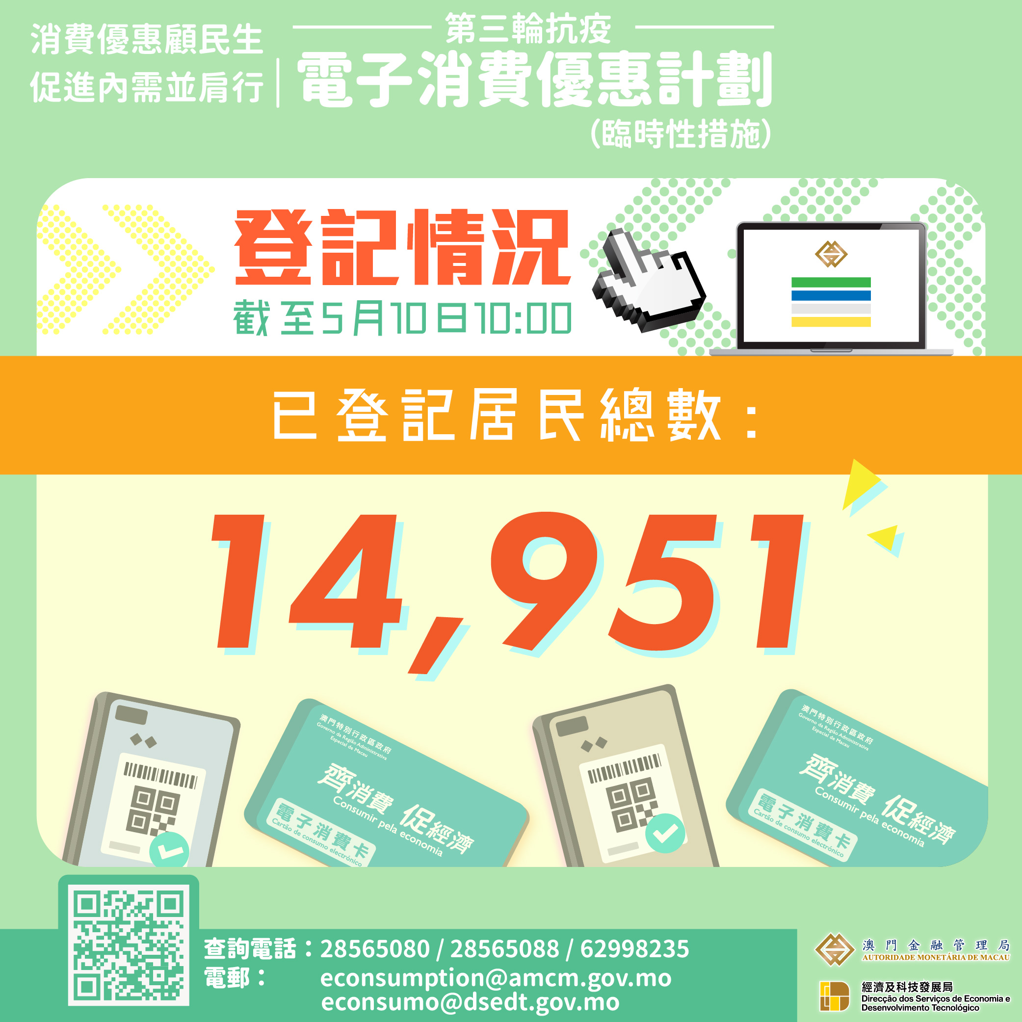“第三輪抗疫電子消費優惠計劃”今(10)日起接受居民網上登記,截至早上10時,已有14,951名居民完成登記,過程暢順。