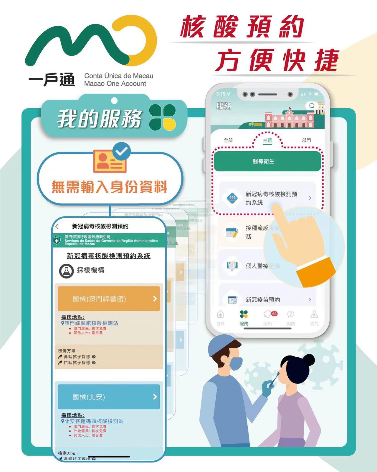 為方便市民進行預約,“一戶通”繼4月推出接種新冠疫苗預約服務後,於今日(5月16日)增加新冠病毒核酸檢測預約服務。市民透過“一戶通”預約檢測時,由於系統已確認本人身份,無需再輸入一般個人資料,預約流程得以簡化,節省時間。
